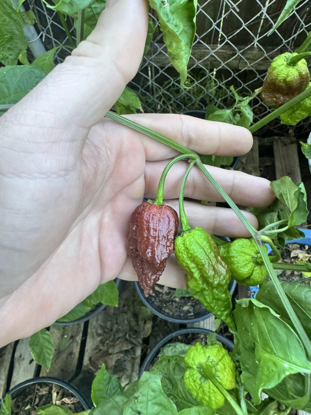 First time growing peppers. These were supposed to reapers but think they maybe chocolate reapers. One of the ripe ones looks more like a ghost and the green have the tail. The ripe one does have the bulb look, it’s just not as pronounced as some of the others. Any thoughts?