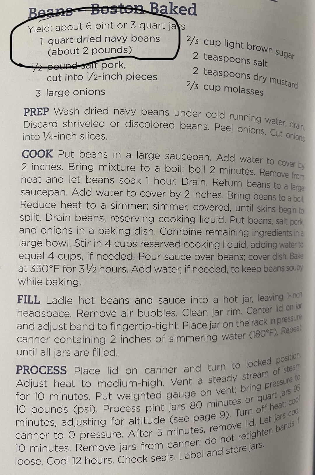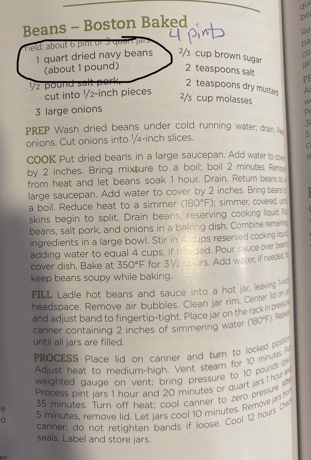 Back in July I made a batch of Boston Baked beans from the 37th edition of the Ball blue book and it says 4 qts of navy beans, about 1 lb. I just went with the 1 lb and bought one bag of beans and made it. Turned out great but only made 4 pts instead of 6. Today I decided to make another batch and grabbed the 38th edition of the book that I purchased a few months ago, it’s the exact same recipe except that it lists 4qts, about 2 lbs. Again I just went with the weight measurement and grabbed 2 bags of beans. As I was preparing everything I felt like I had so much more beans than last time and grabbed the other book to compare 🤦🏻♀️. I’m sure I’ll get the full 6 pints this time.