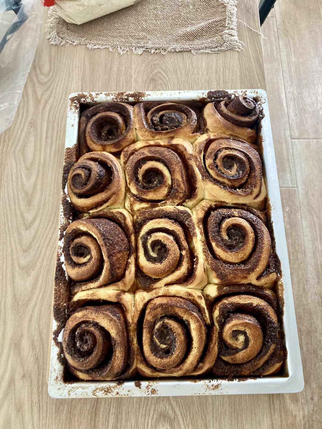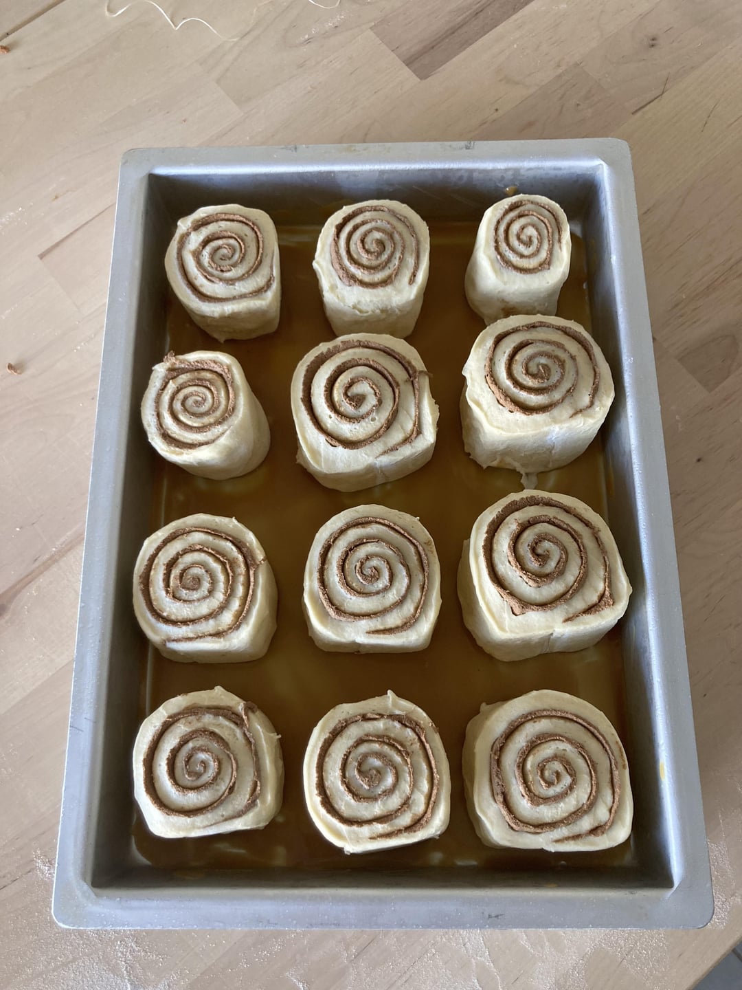 Roll the dough into a 60×25 cm rectangle, spread the cinnamon paste, and shape the rolls (dental floss is your friend). The dough should be 0,5 – 1cm thick, do not roll it too thinly or the rolls will be dry ! The rolls should be approx 5cm high. This recipe yields 12 big rolls, that should be ideally baked in a 23x33cm pan (9×13 inches). Put the rolls directly on the caramel layer (grease the pan if your are not using caramel).
