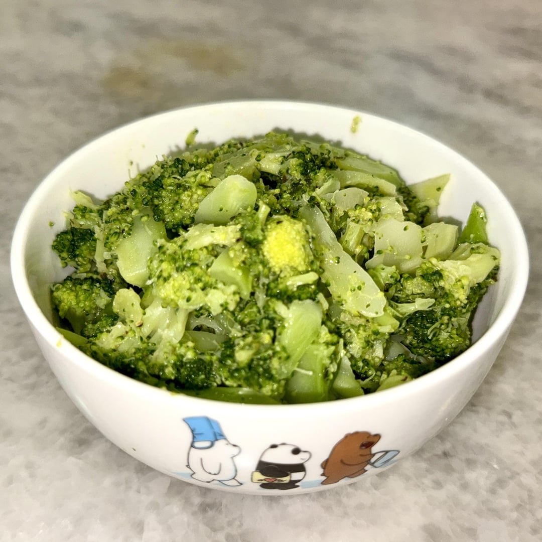 Chop broccoli into bite size and place on steaming tray. Steam for about 5 minutes. Add about 80 grams of garlic butter or to taste, sprinkle some sea salt and ground black pepper. Mix and serve.