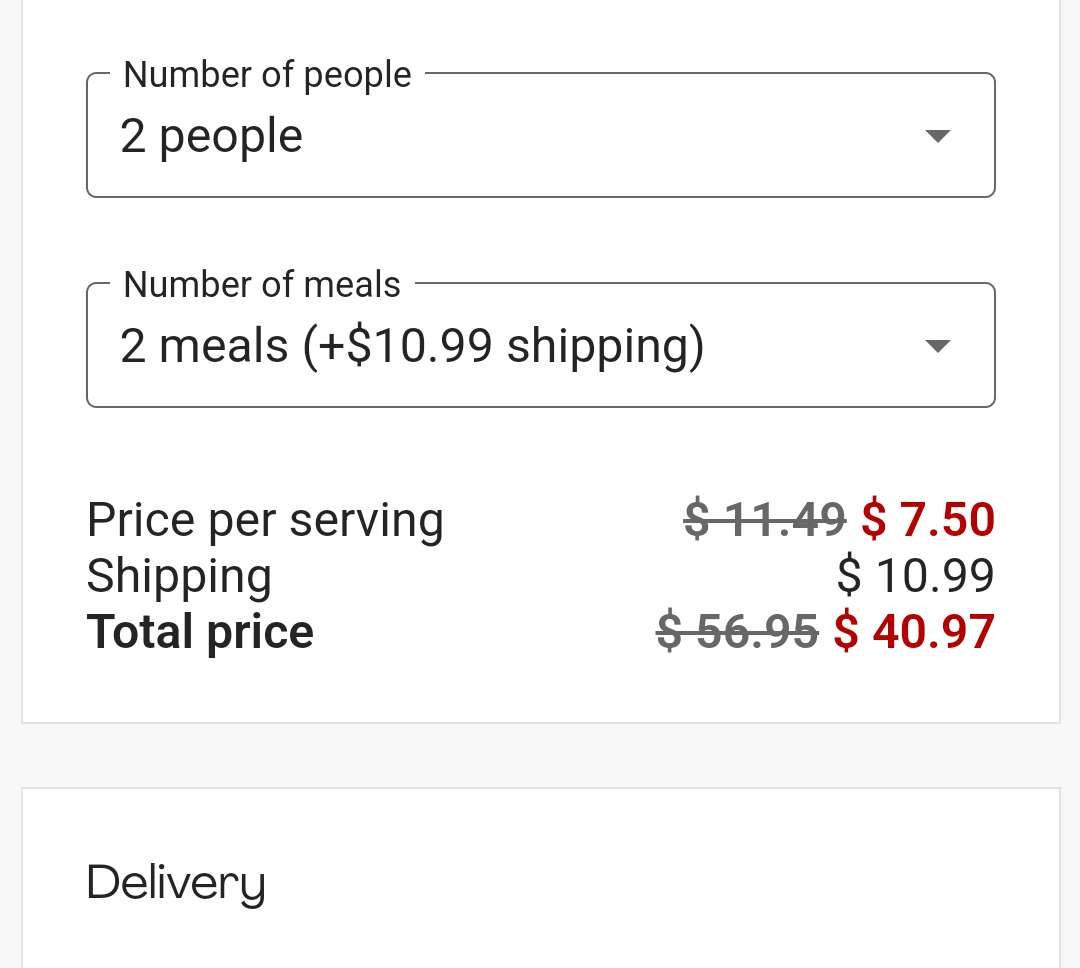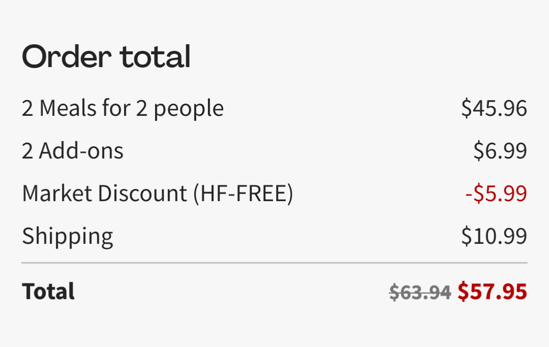 The price in the second screenshot does not include shipping or the 2 add-ons you have listed in the first screenshot. You are seeing only the 2 meals in the second screenshot minus the market discount. $45.96-$5.99 =$40.97. Now, take that total and add the shipping and two add-ons. That’s why it’s an increased price.