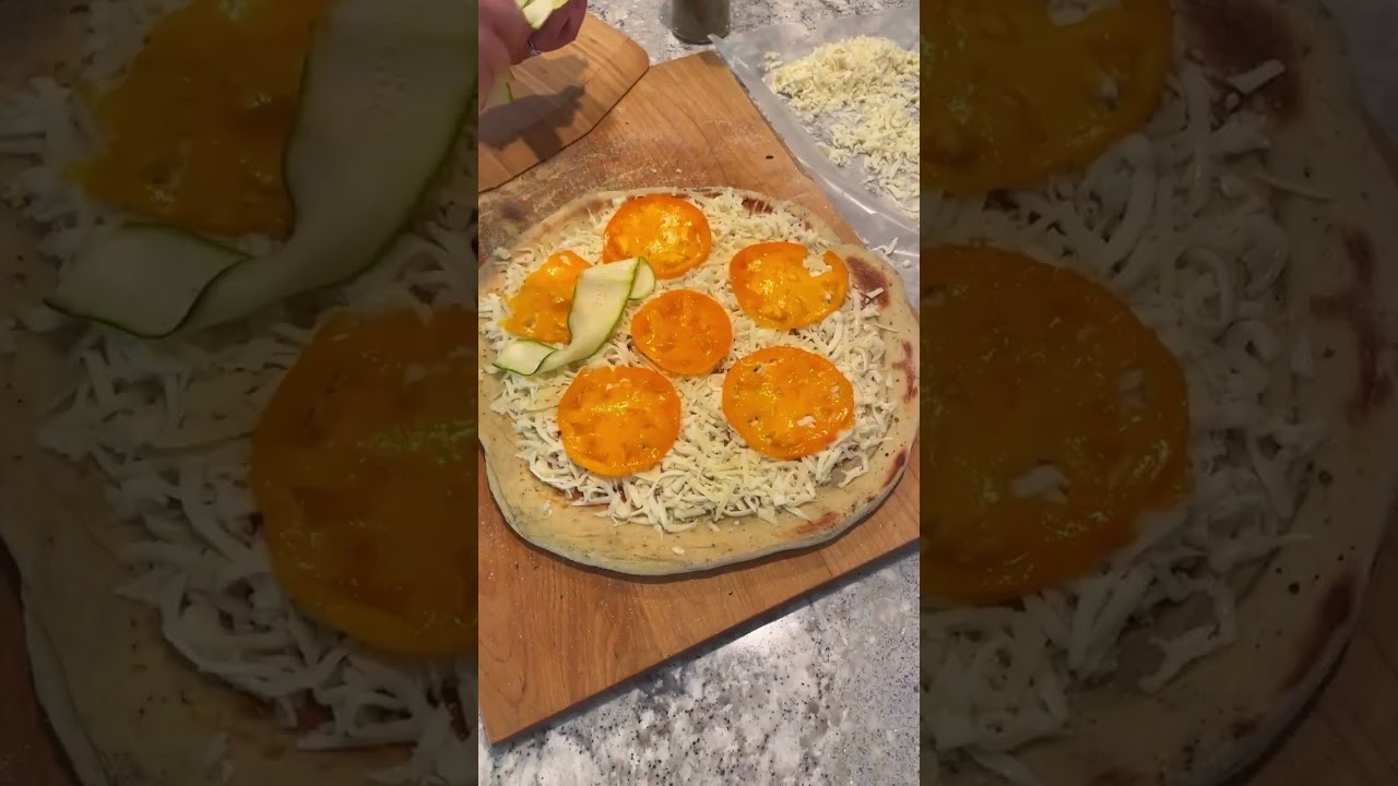 3. Flip over pizza crust and top with a drizzle of olive oil, half the Italian seasoning, shredded mozzarella, tomato slices, zucchini and remaining seasoning.