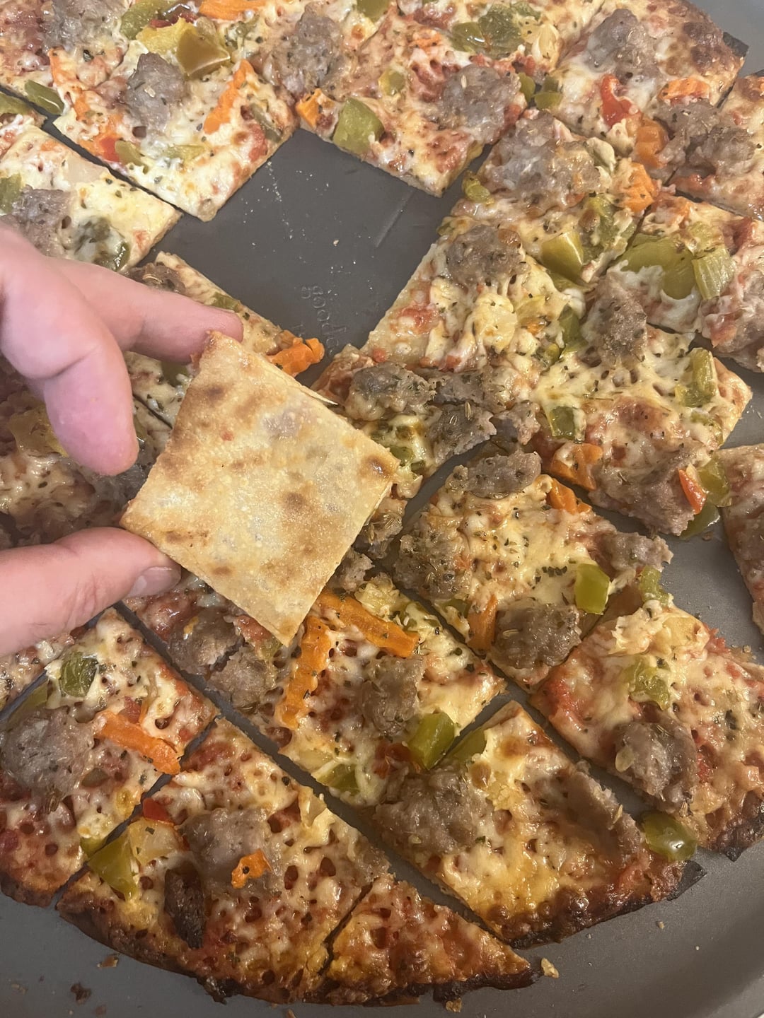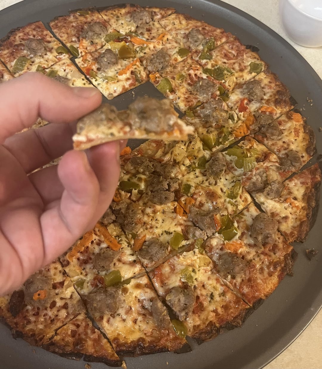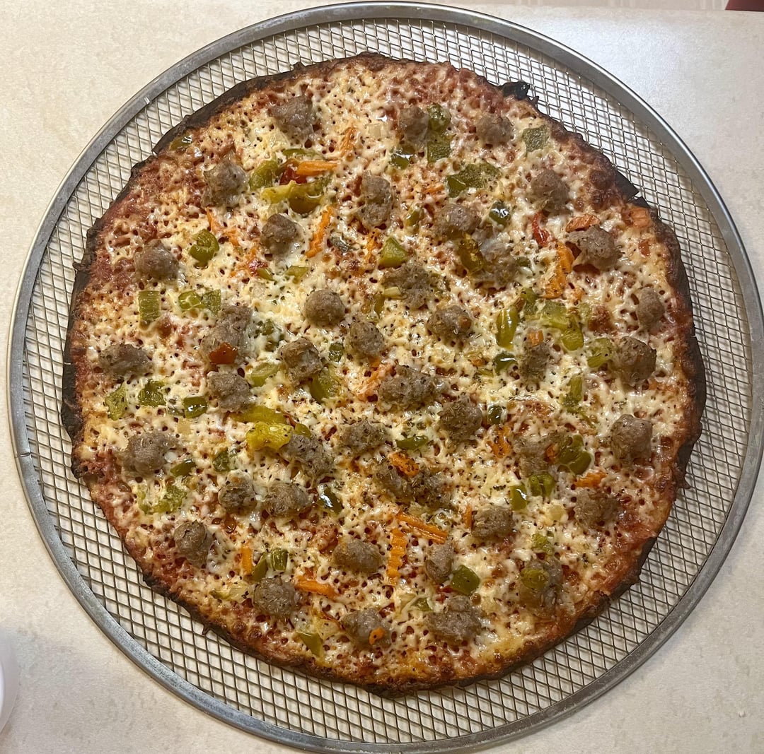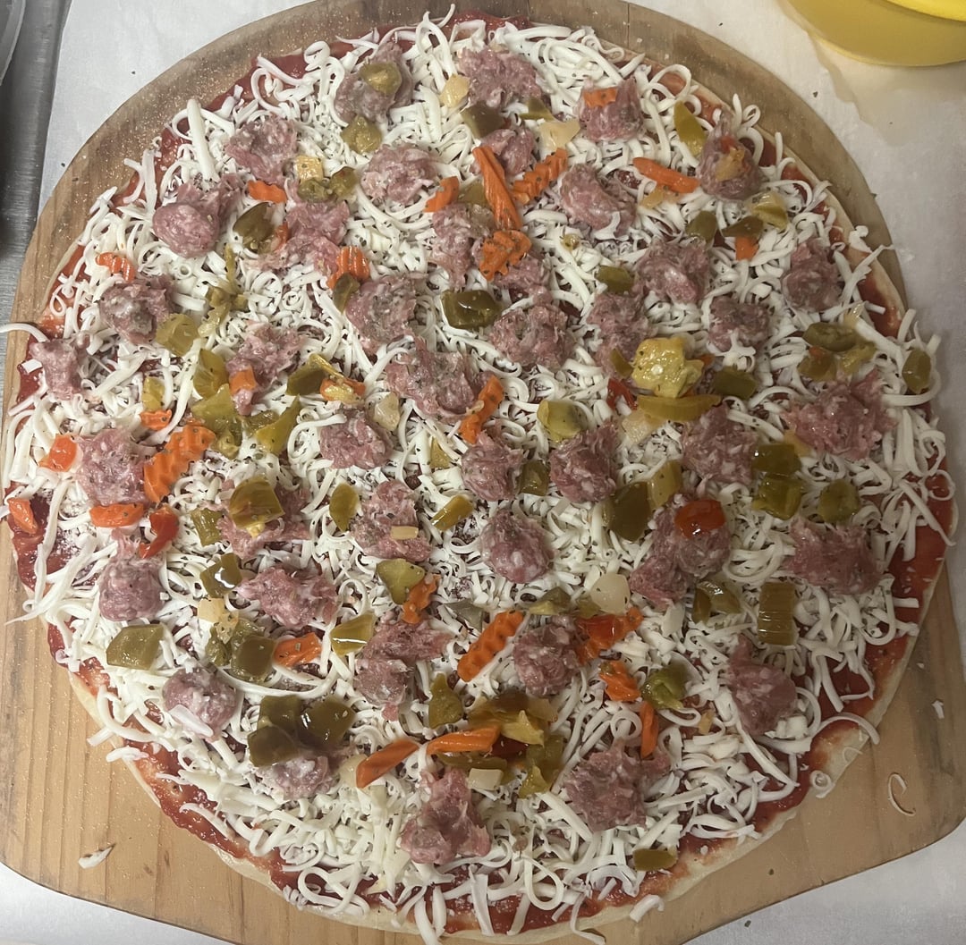 Mixed my own sausage, sauce, oil packed Giardiniera, dusting of pecorino.
