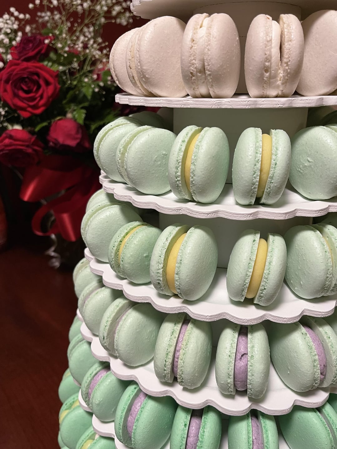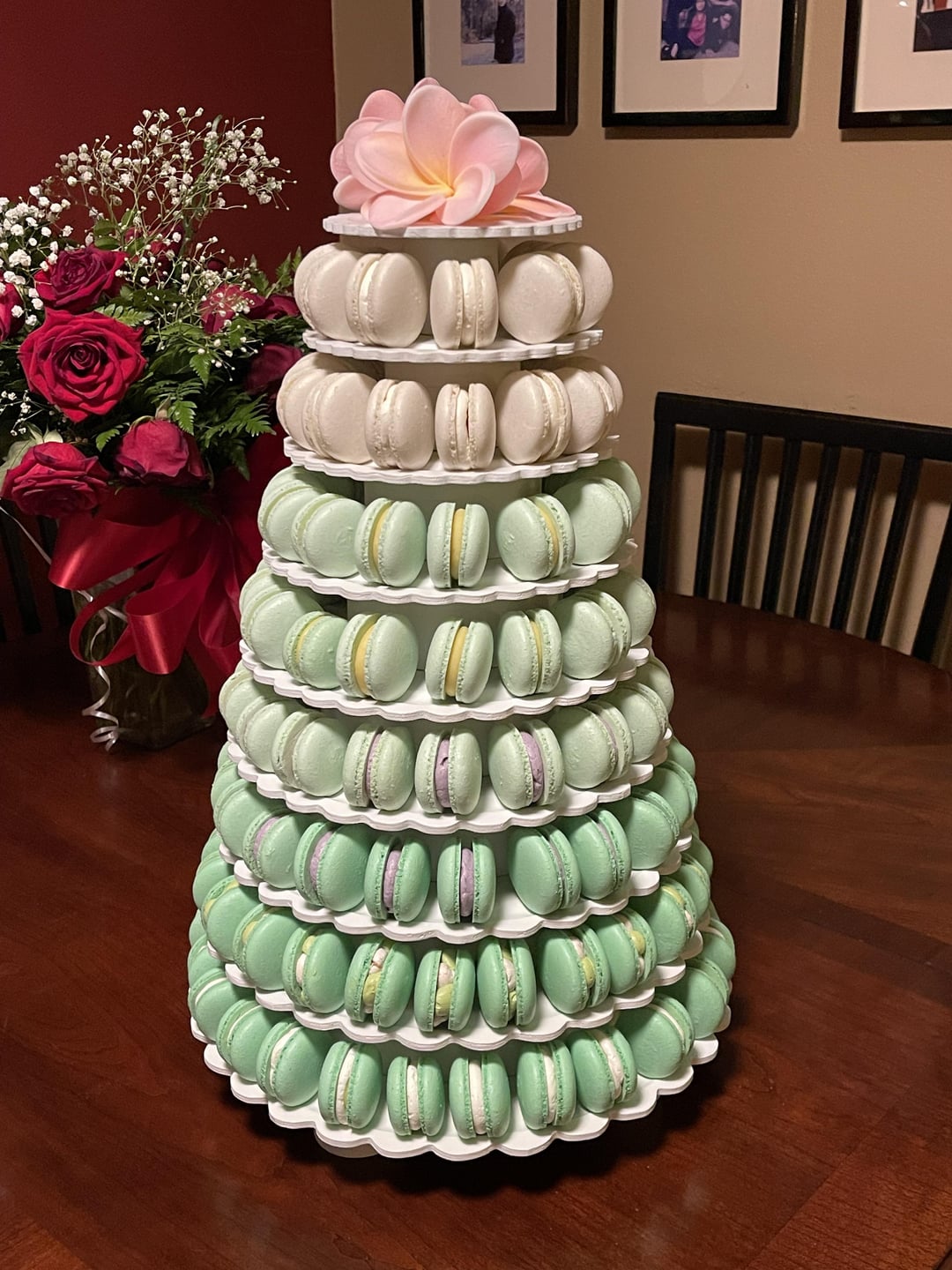 Doing a run through before the event on Saturday. Tiers 2 & 3 are filled with Vanilla IMBC with Dulce de Leche center, Tiers 4 & 5 with Passionfruit Ganache, Tiers 6 & 7 are Ube , Tier 8 with Strawberry Matcha and Tier 9 with Vanilla IMBC with Yema center. The flowers on top are temporary. I still need to get fresh flowers for the top on Saturday morning.