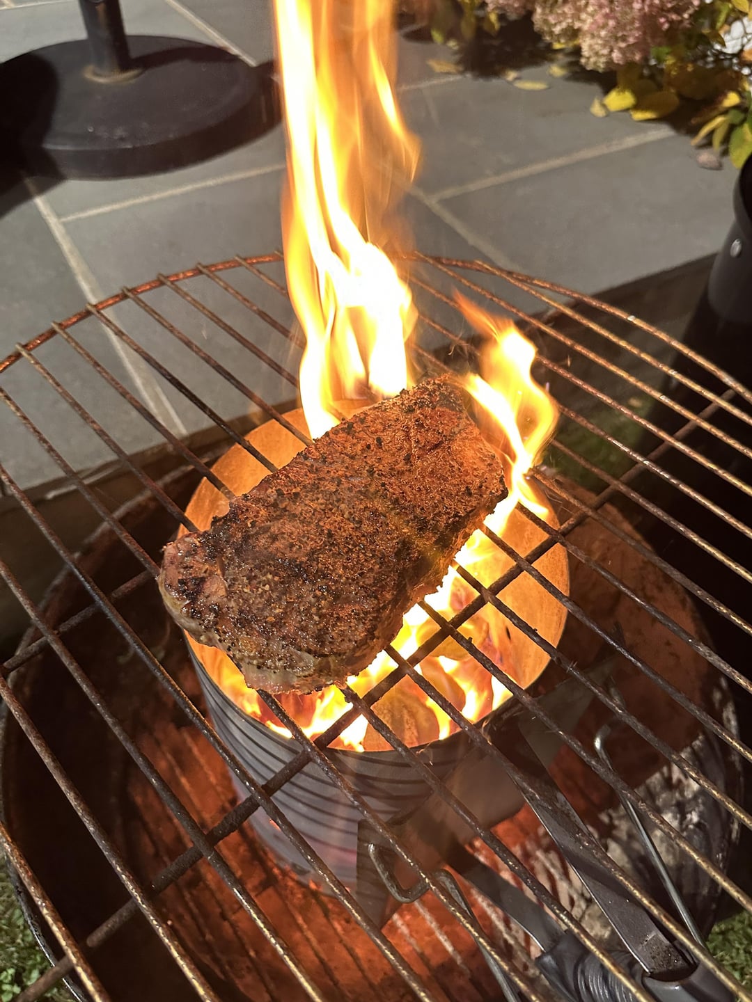 If the steak is small enough..put it under the coals. No flare and closer sear