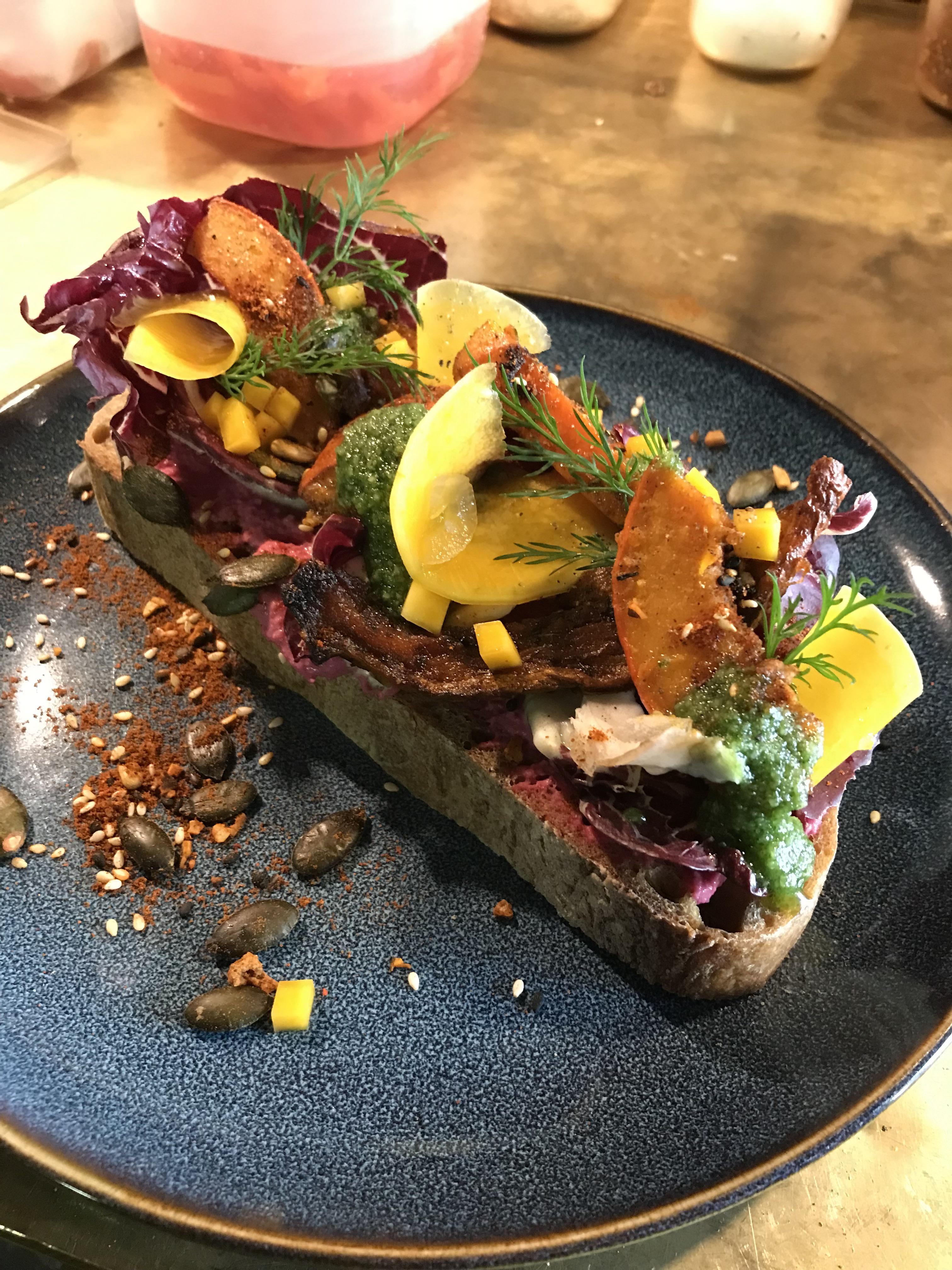 The sprinkle of pumpkin seeds and spices on the plate are not a good addition, Set the plated item up on a tray and then move the finished item to the plate. Maybe serve the radiccho on the side. Shredded radiccho, dressed with a vinaigrette with made with the pesto. Less on top of the bread may help but it’s still just an open face sandwich.