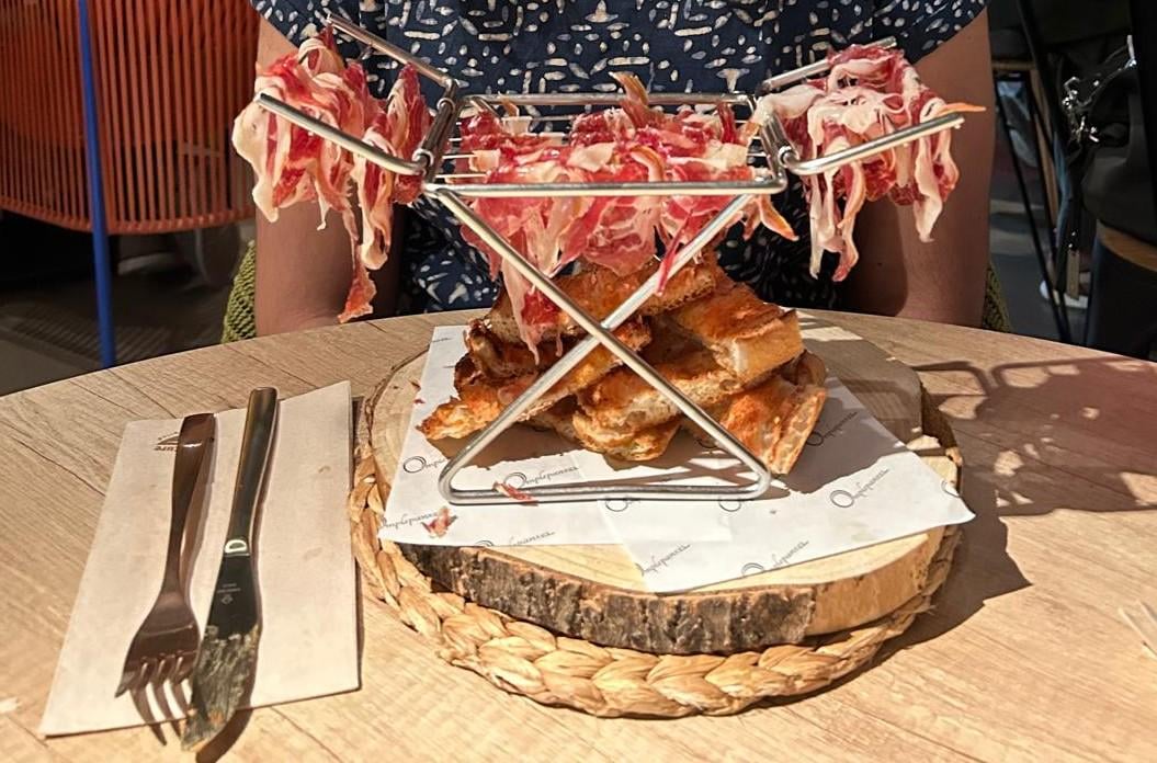 Cute display of Ibérico ham and toasted bread at the restaurant Omplepanxes (literal translation is "filling tummies") in Sabadell, Spain.