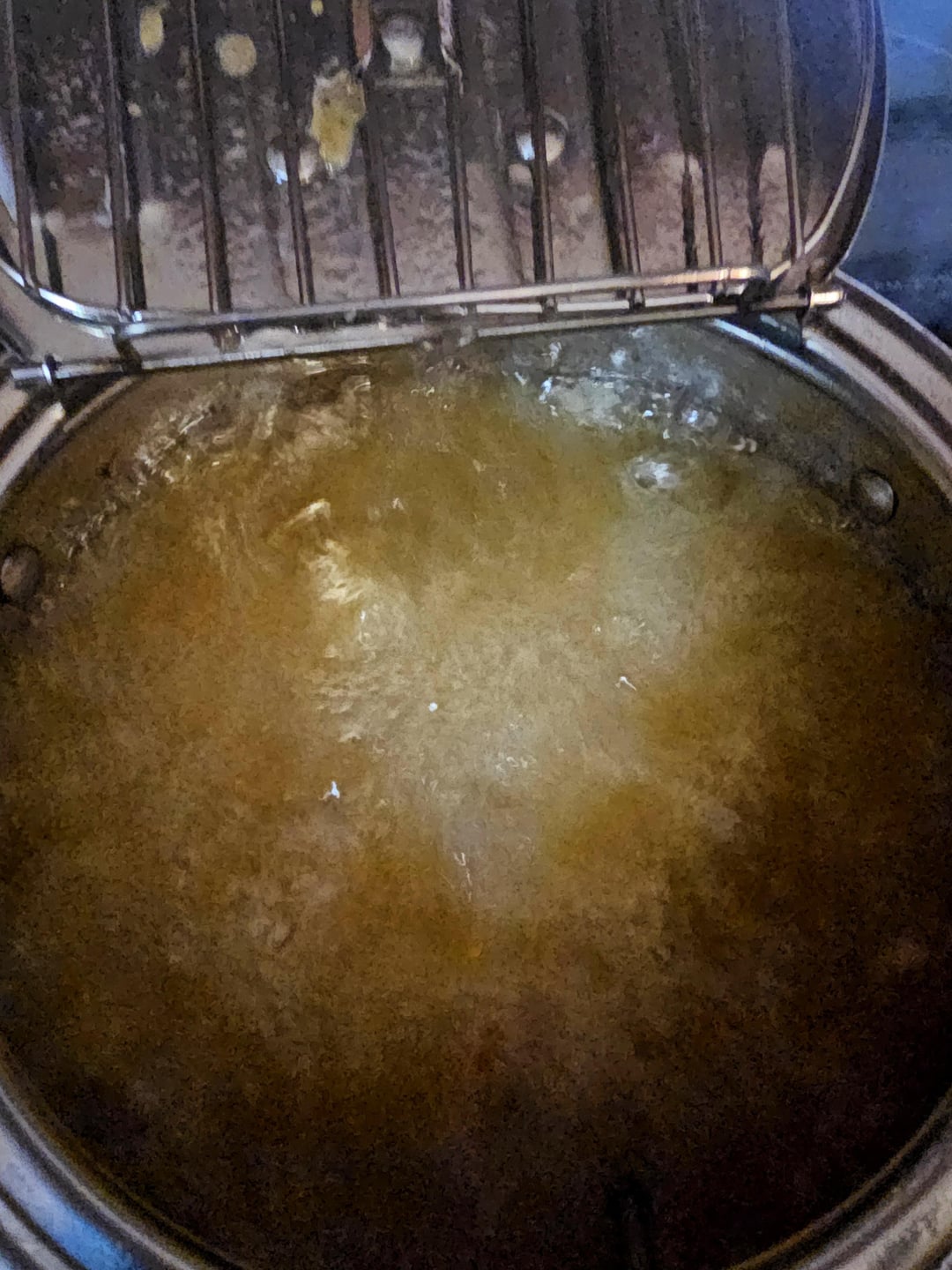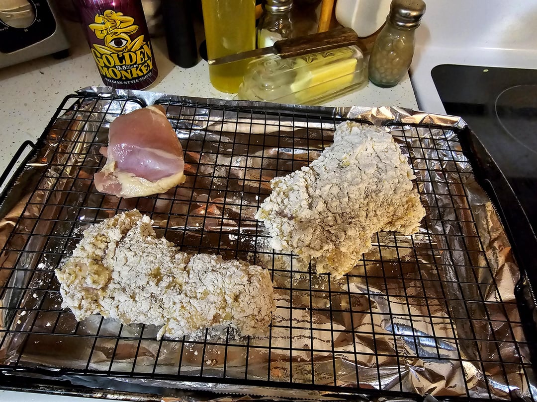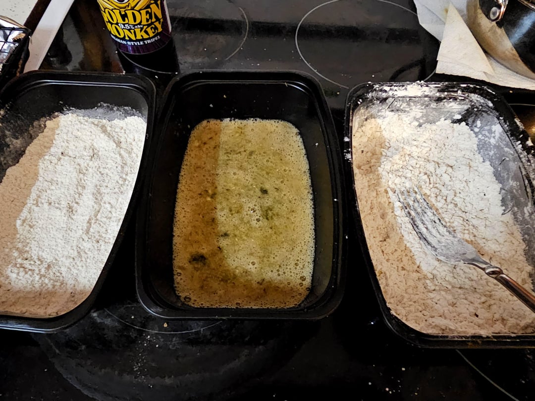 Salt & Pepper the chicken, flour, egg, flour/cornstarch mix with a little beer to chunk it up, then fry until crispy. Usually I'd season the flour/egg/mix but figured I wouldn't taste the difference and was lazy so I skipped that part 😂