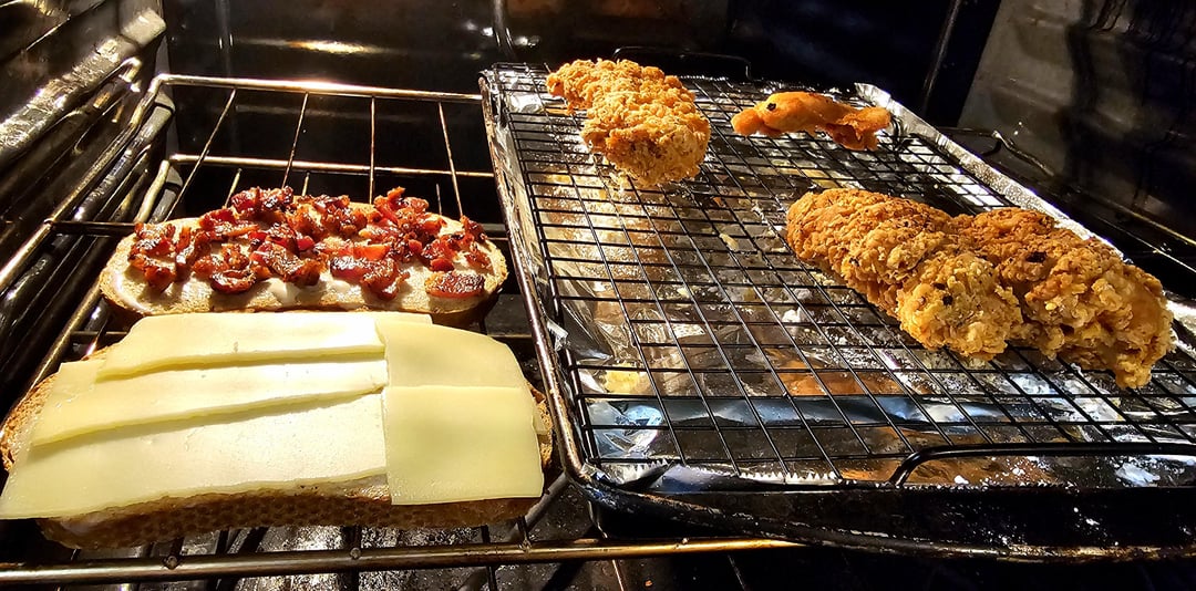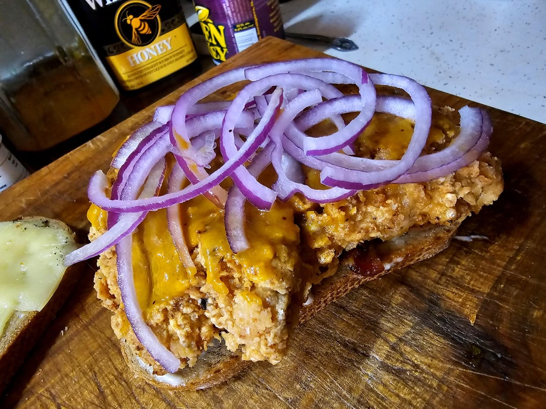 I had some leftover rye bread and bacon bits from some other stuff I made earlier this week, so I tossed that in the oven with some cheese. Cover the chicken w/ sauce and don't forget the onions 🤣