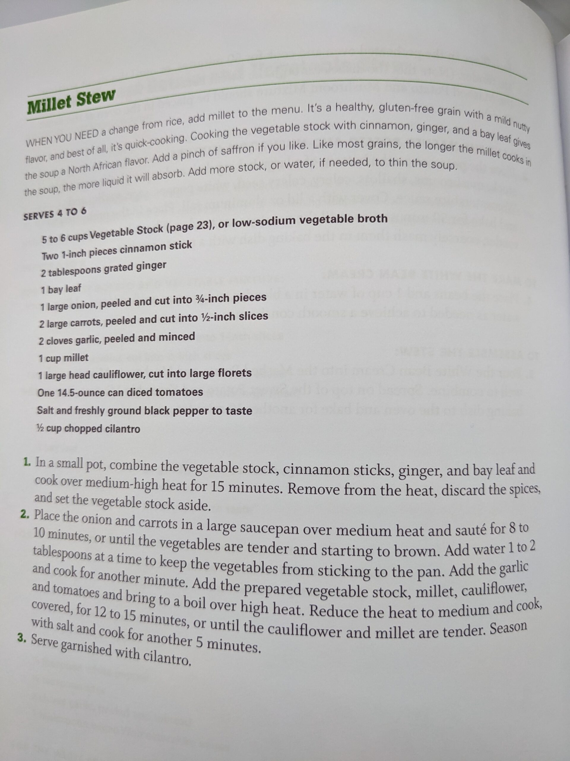 **Ingredients:** – 5 to 6 cups vegetable stock (low-sodium vegetable broth) – 2 pieces cinnamon stick (1-inch each) – 2 tablespoons grated ginger – 1 bay leaf – 1 large onion, peeled and cut into ¾-inch pieces – 2 large carrots, peeled and cut into ½-inch slices – 2 cloves garlic, peeled and minced – 1 cup millet – 1 large head cauliflower, cut into large florets – One 14.5-ounce can diced tomatoes – Salt and freshly ground black pepper to taste – ½ cup chopped cilantro (for garnish)