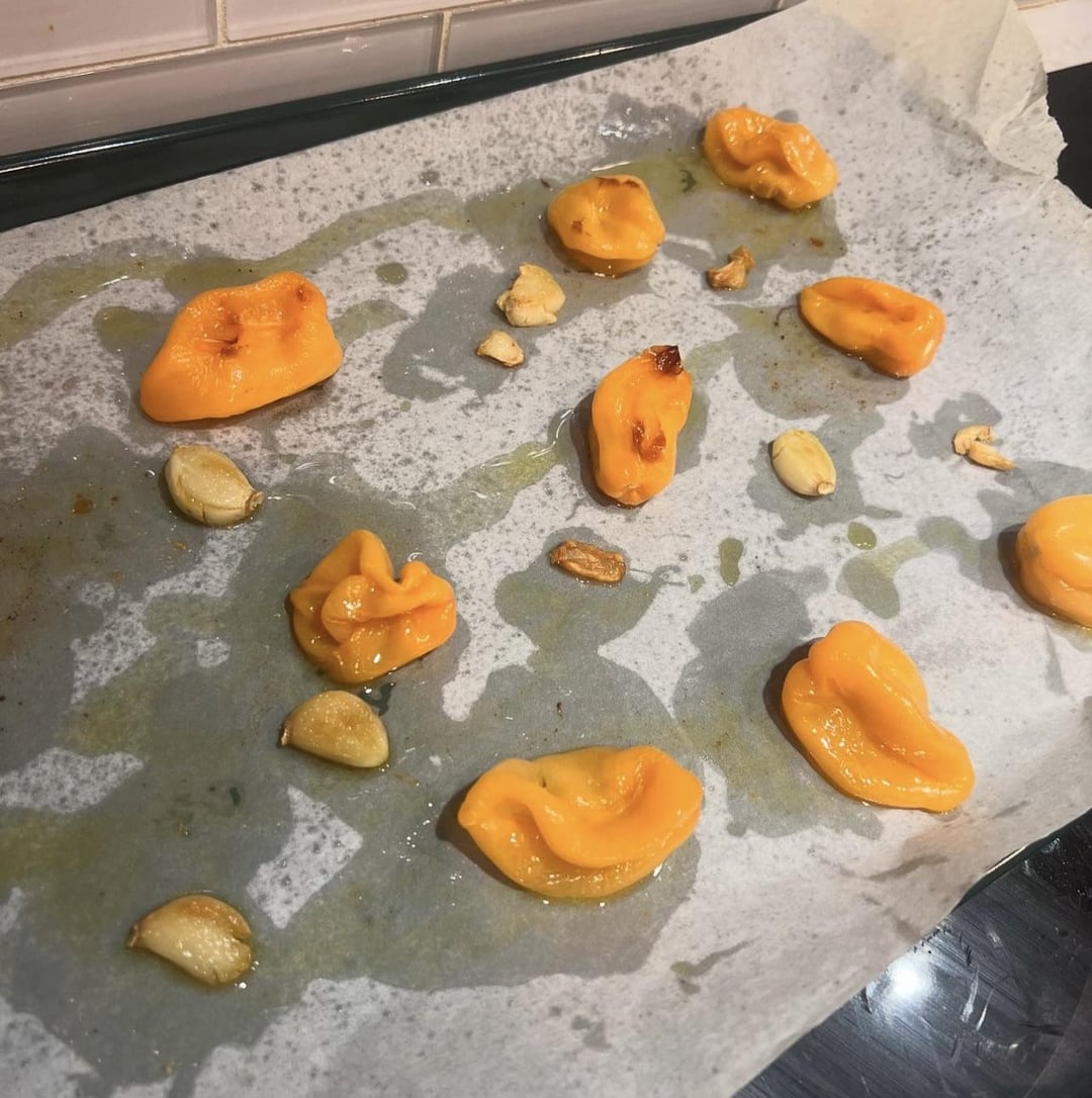 2. Place the habanero peppers and garlic on the baking sheet. Drizzle with 1 tbsp of olive oil and toss with tongs to coat. Note: Do not touch the peppers with your bare hands.