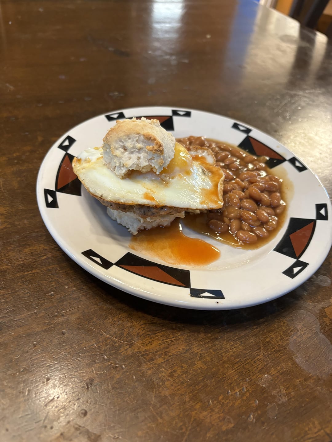 Smashed breakfast sausage patty and fried egg on a homemade and way too small biscuit. Franks red hot sauce and honey.by hammerto3 Write A CommentYou must be logged in to post a comment.