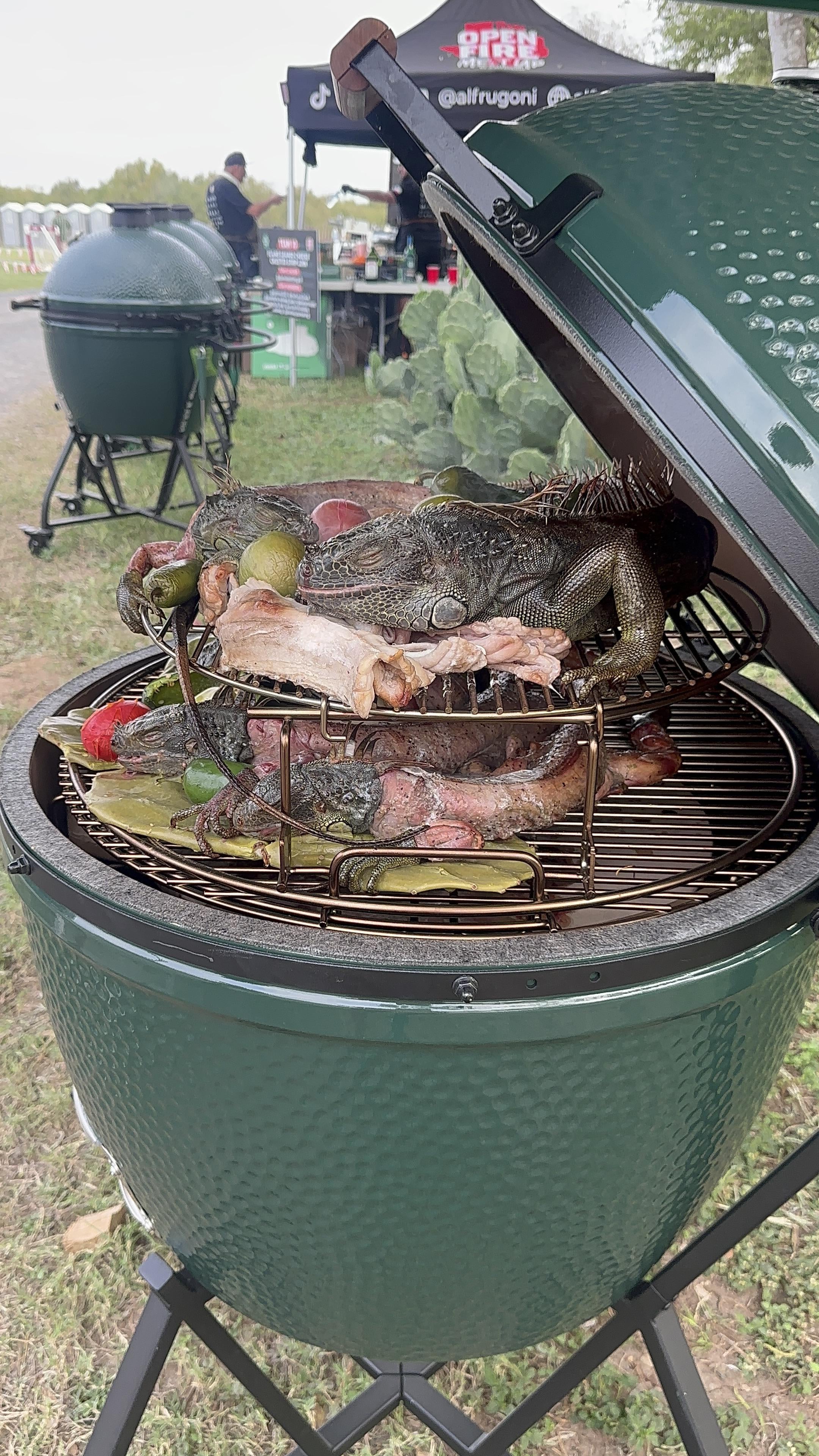 We got invited to cook for Big Green Egg at the Texas fire open meet up. We knew we had to do something special so we collected iguanas from the backyard in South Florida, brought them to Texas, we smoked them, shredded them, and cook them into a giant pot of posole! Oh, did I mention that we won third place overall?