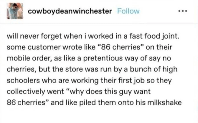 In a professional kitchen, line cooks would see 86 cherries and throw them all away.