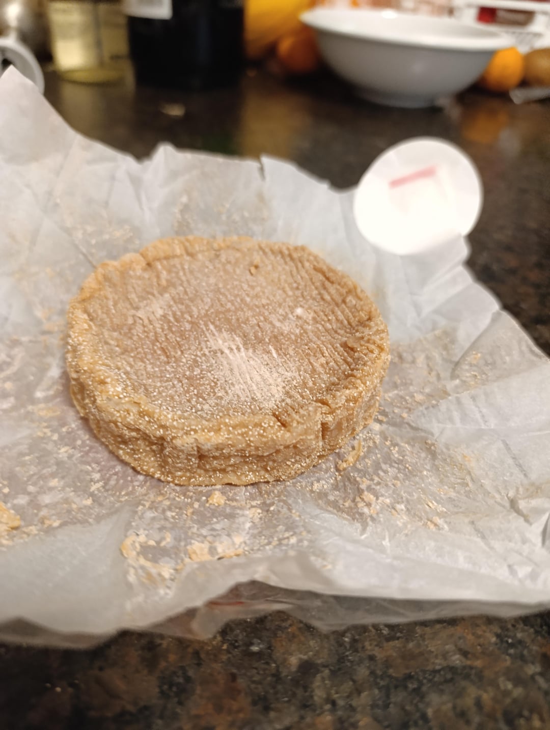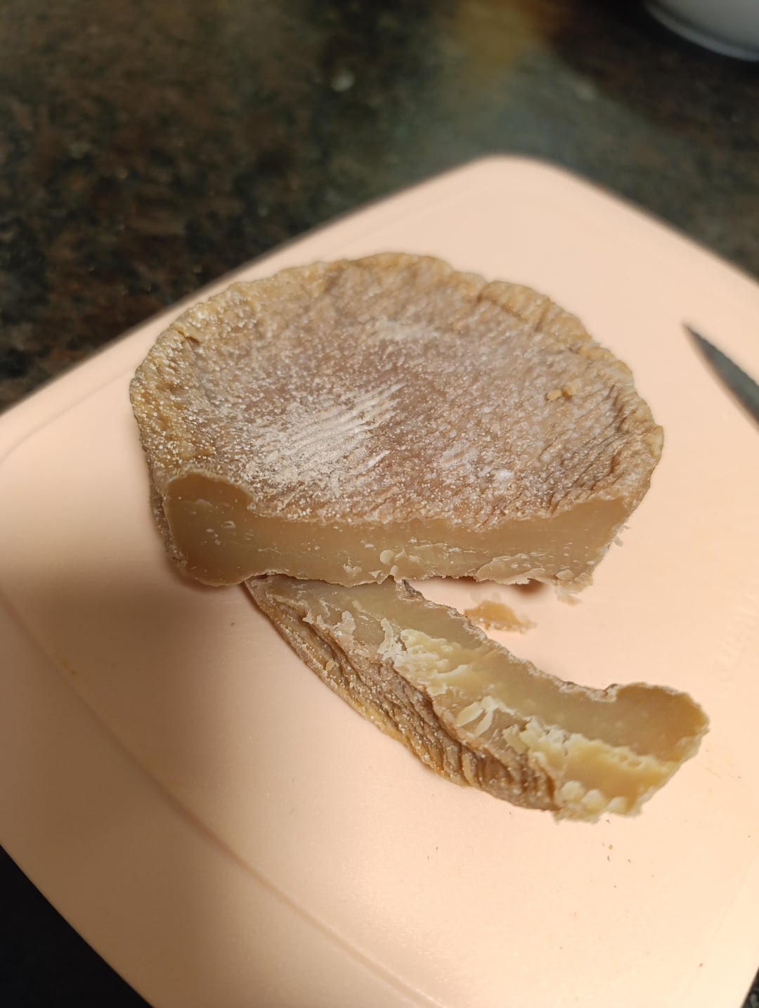 Once again a ripening Experiment. Store(Lidl) bought Münster was left in the fridge for some months( best before March this years) was allowed to breathe and transformed Into a really nice hard cheese. Not totally crumbly yet, but WE will See what it looks in some months. Taste is nice and earthy, until now Zero ammonia smell or Taste. I am pleasantly surprised, i Had espected IT to need at least 18 months Not 8 to get ro this state, vastly different to my prior experiments with brie. I think the breathing is the distingusishing Factor.