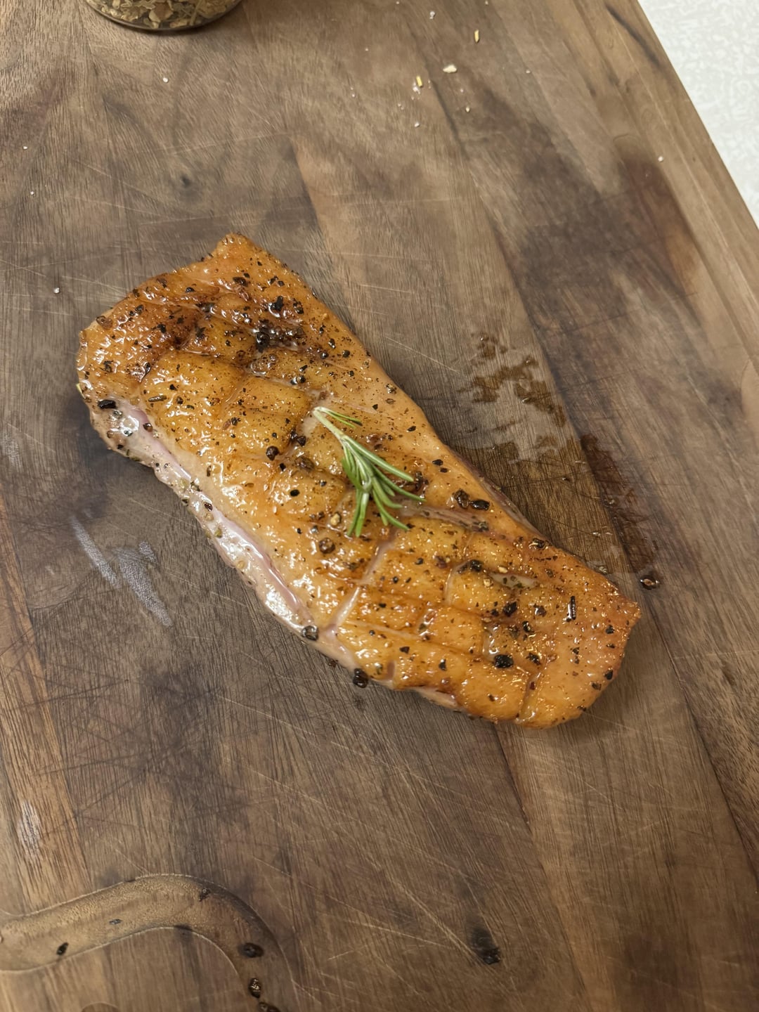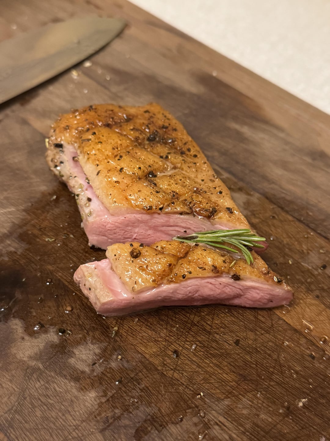 I usually do duck breast at 130° for two hours but I bumped it up a notch today just to see what it did for the skin and I loved the results. I air dried in the fridge on a rack for 2 days, after a light salt and peppering. Then put them in the sous vide at 131.5° for two hours, patted dry, seasoned with some poultry seasoning, and seared in a cold stainless steel pan for a nice, crisp skin. The best duck breast I’ve ever made. No ice bath needed!