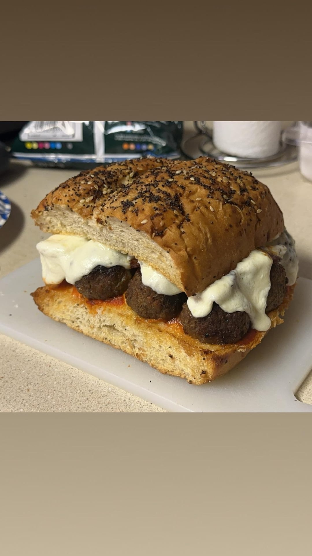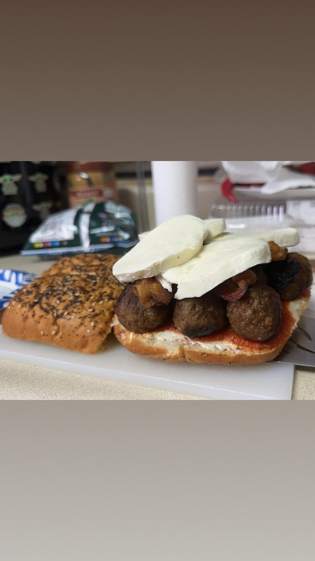 Pizza sauce, beef meatballs, mozzarella cheese, bacon, and mayo on everything seasoning Italian bread.