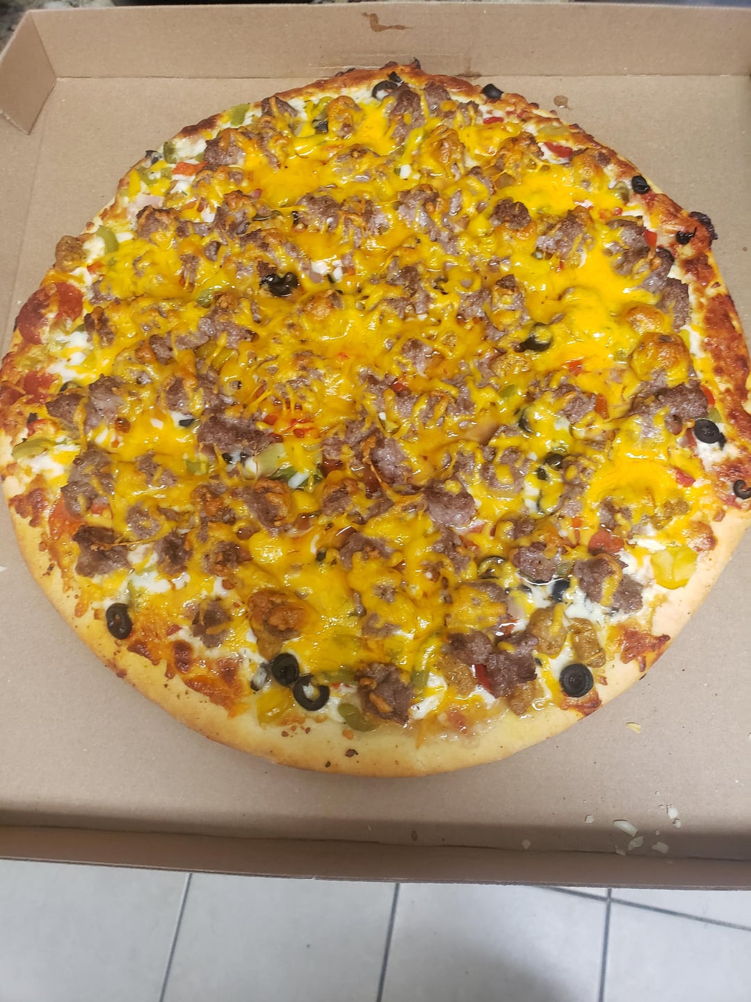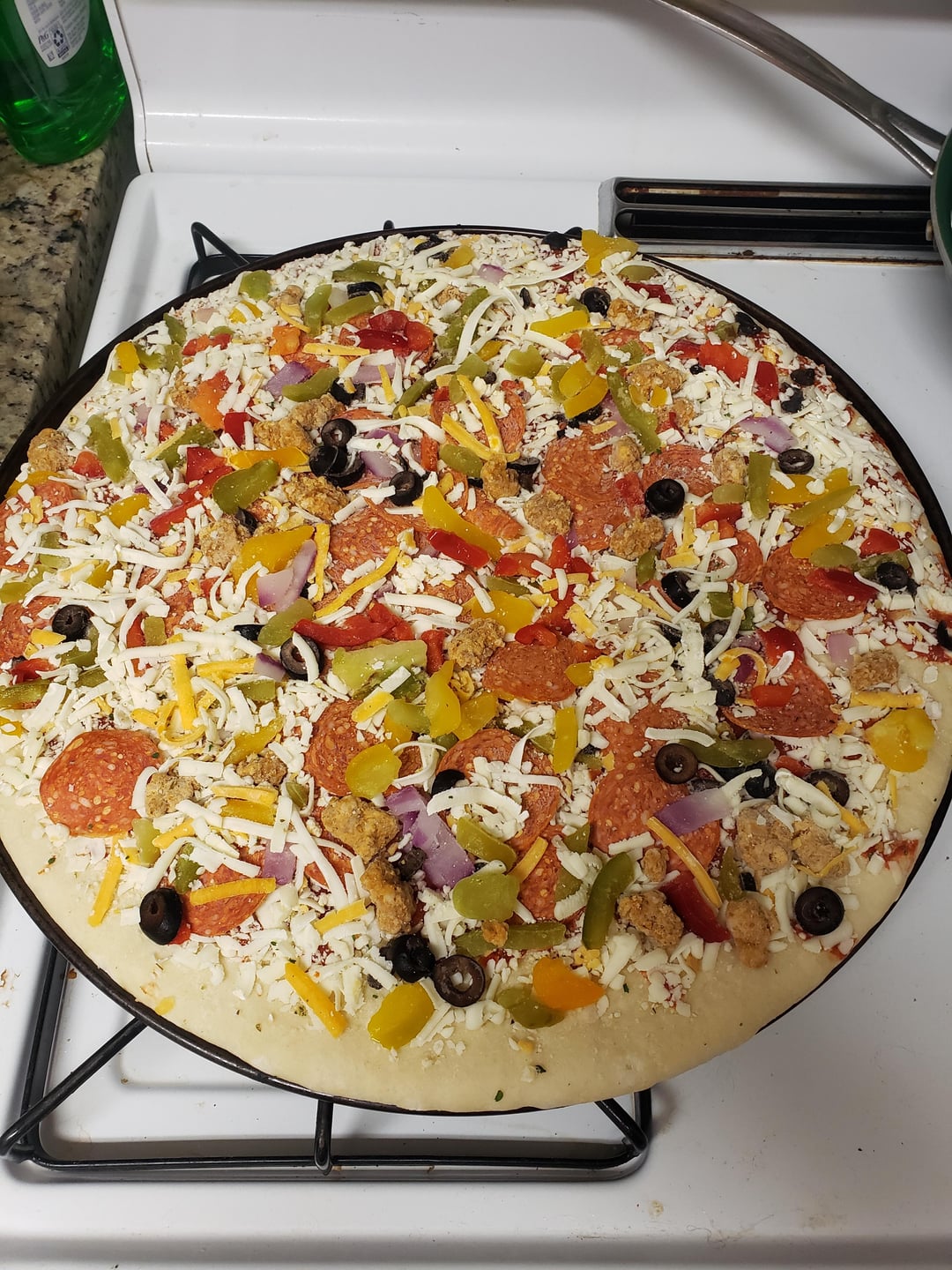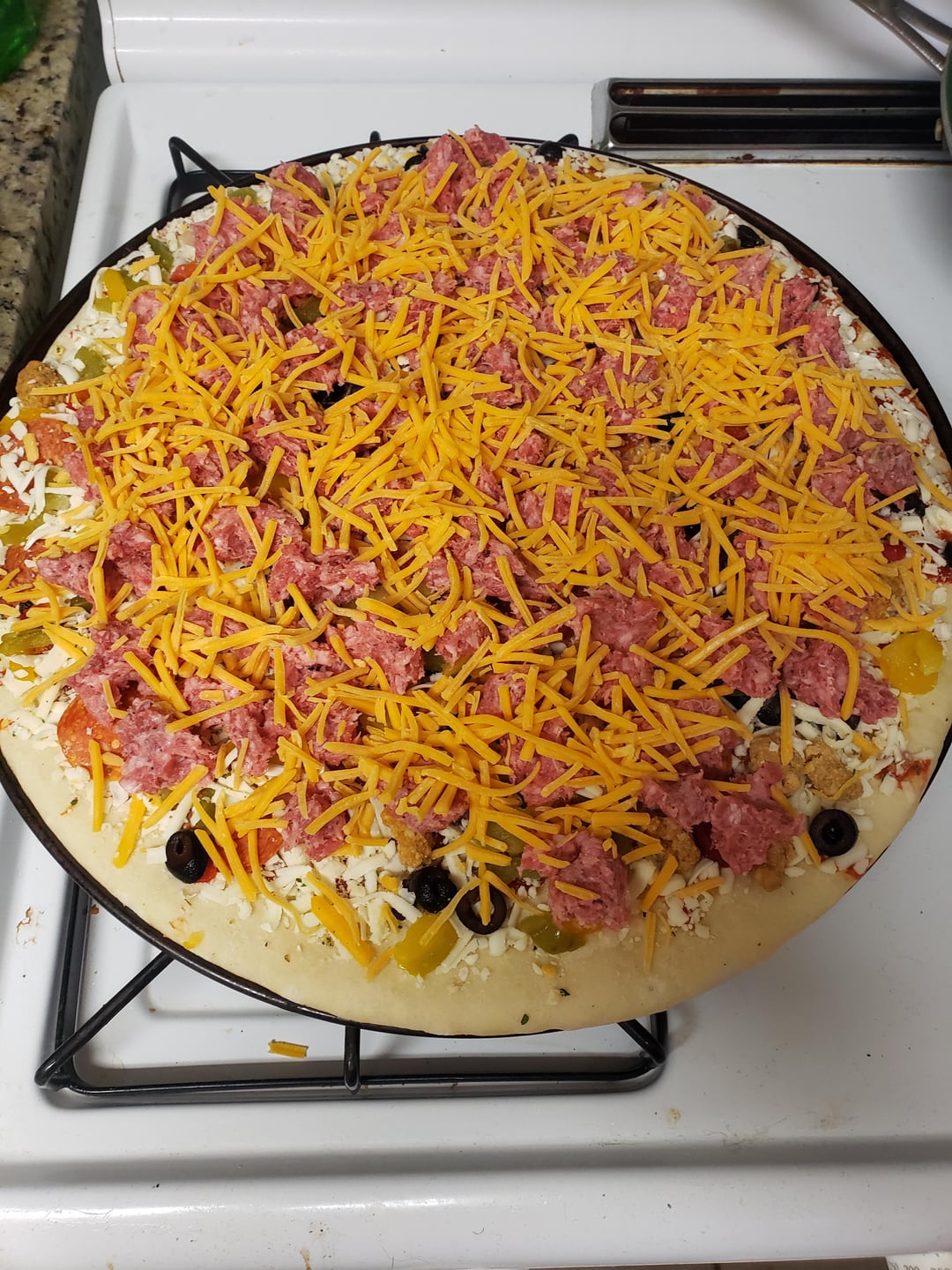I present you with the evidence. One Mama Cozis Supreme pizza. One whole log of Aldi's breakfast sausage, criminal amounts of cheese on top of it all, and crushed red pepper flakes while it cooks. What say you?