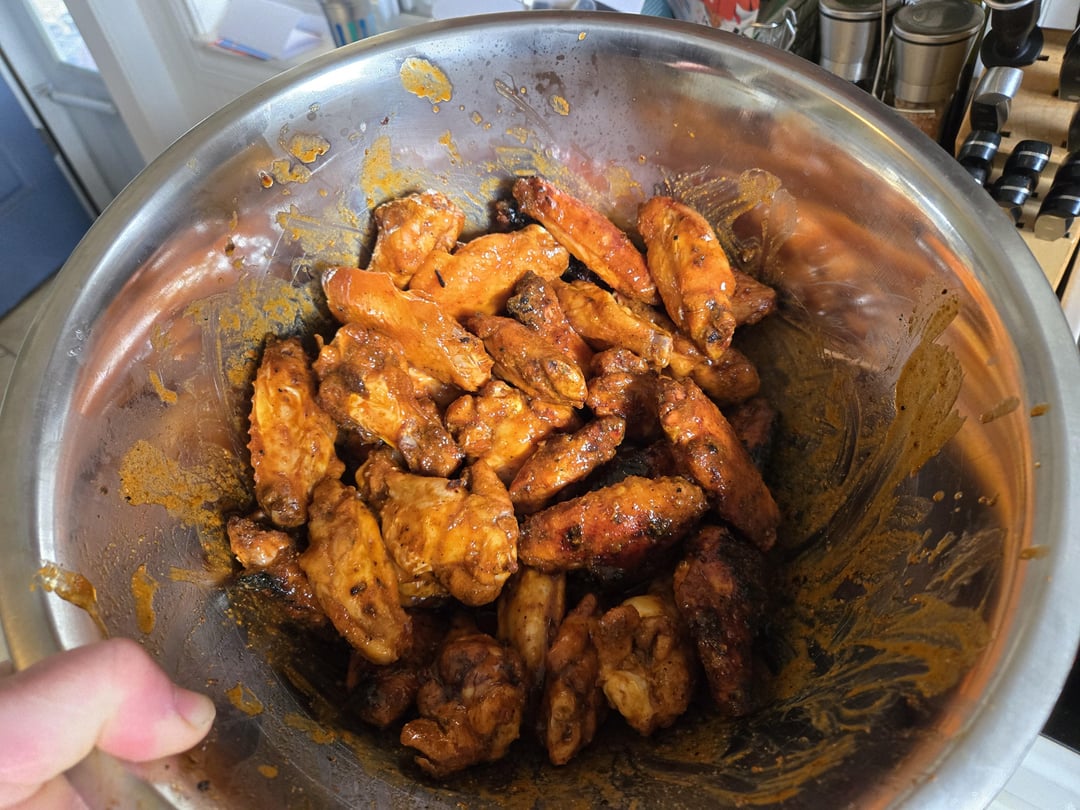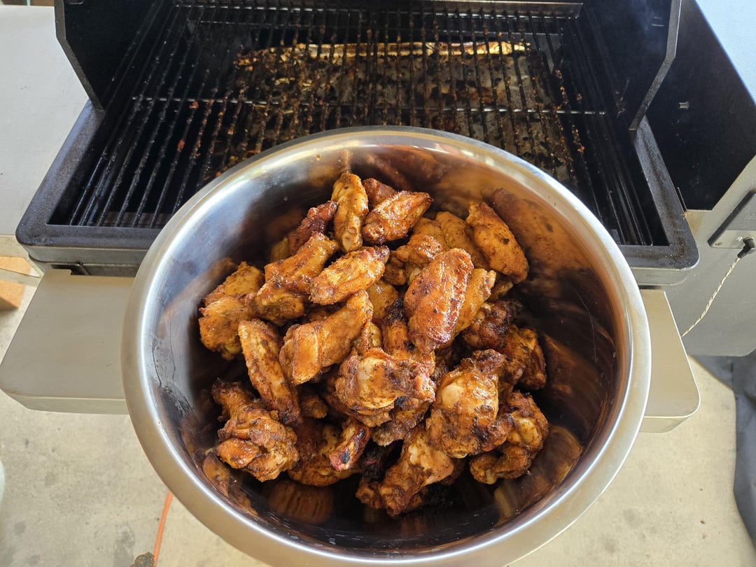 Making wings for friends and fam getting together to watch the Bills game. Wanted to give the 0-400 method a try but decided to run at a lower smokier temp for a bit before bumping up temps. Used 8lbs of wings and rubbed with a mix of Salt, Pepper, Garlic Powder, Onion Powder, Paprika, Mustard Seed, Celery Seed, & and pinch of Sugar. Threw on with the Traeger cold, started and Targeted a temp of 225 for 30minutes. Then bumped to 400 for 45minutes, flipped halfway through. Tossed in Franks Red Hot and Buthere. Go Bills!