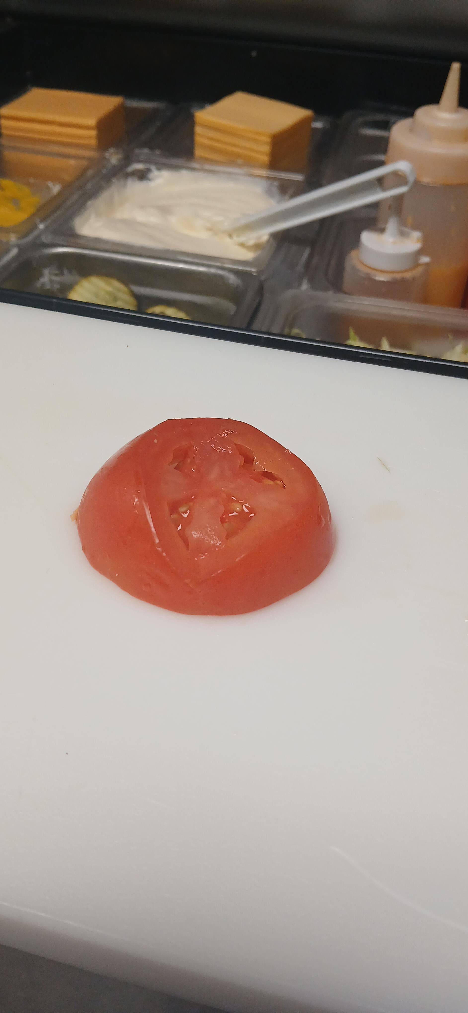 Somehow morning crew tomatoes are always the worst. We had someone who refused to listen when we taught her how to cut tomatoes and each night could take a slice she did and get at least 2 more out of it 😭🤣