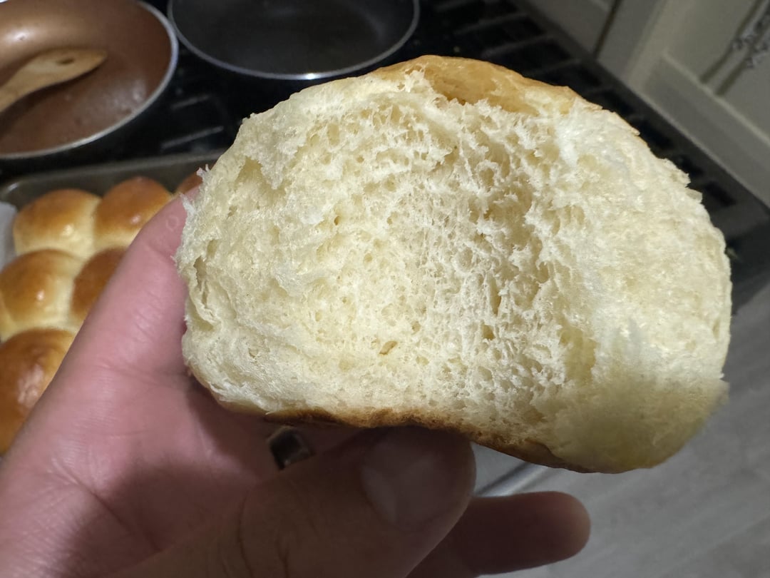 113g water, 113g sour cream (half cups), 4 tablespoon butter, 2 tablespoon agave syrup, foamed 2 tsp yeast at 105 degrees . 10g salt 500g bread flour and 2 large eggs thoroughly kneaded in mixer. Proofed what I thought was too long as it more than doubled, rolled into 16 balls and let rerise. Egg wash and baked at 400 for 17 minutes