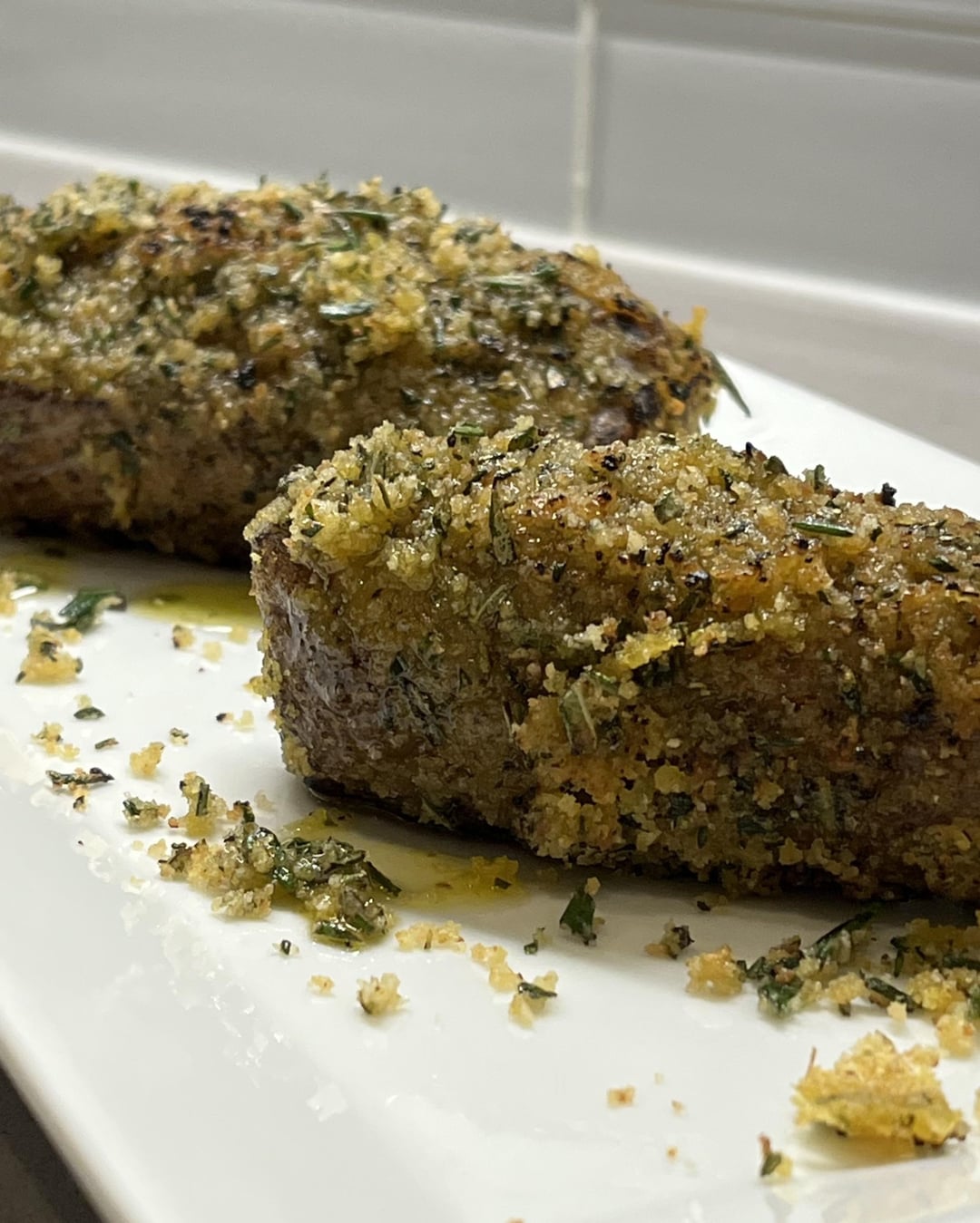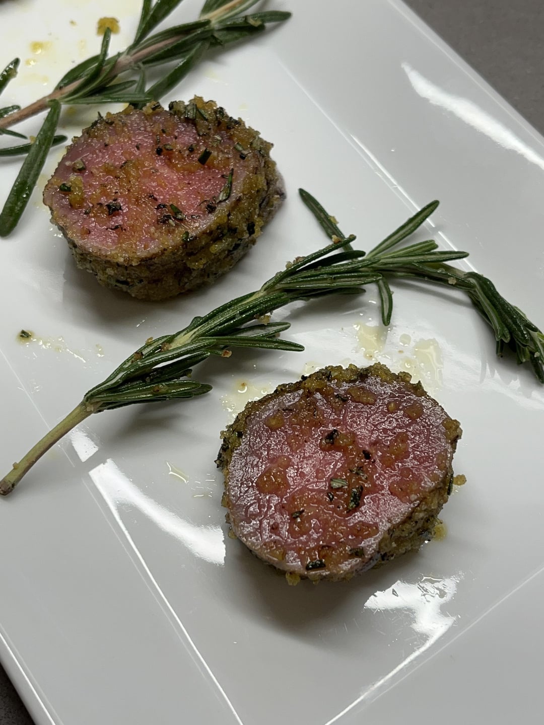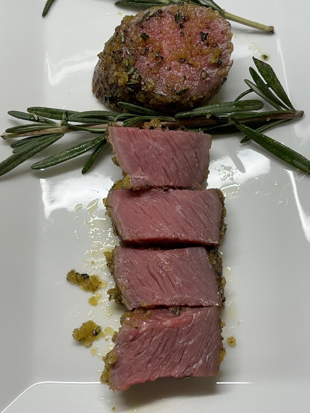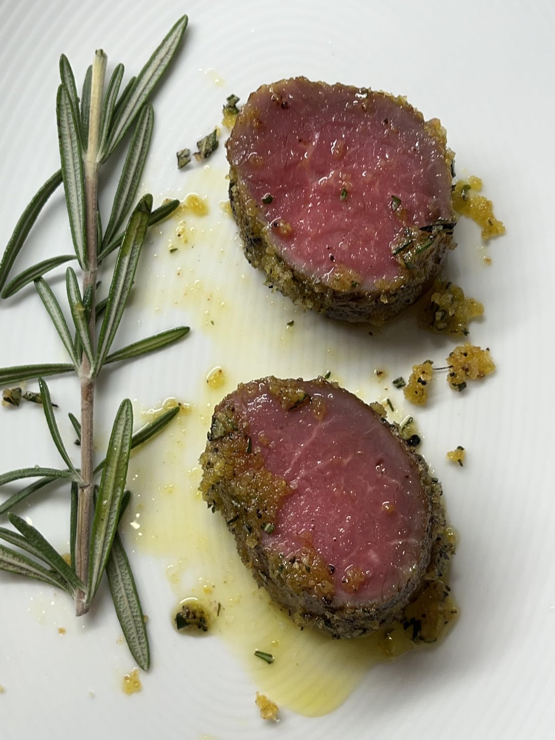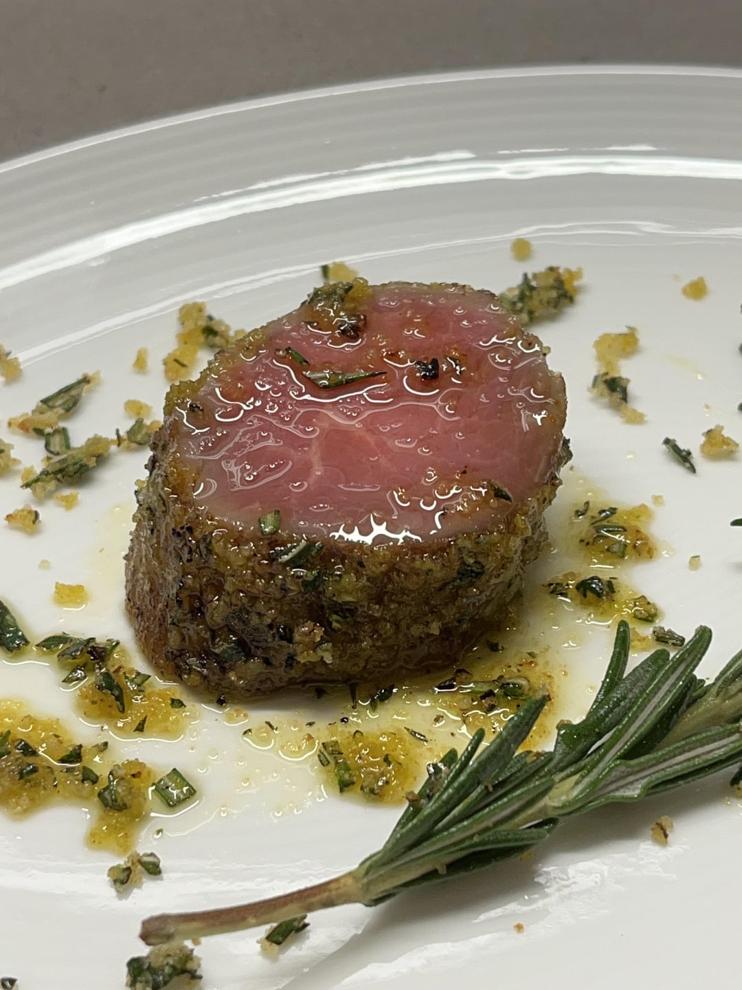 dry brine 24hr or so > removed muscle/loin from the rack > pre-seared w/ torch sv-gun > 131.5f APO combi-oven 100% steam sv mode for 90min > mustard binder + bread crumbs and rosemary > brief torch w/ searzall > slice