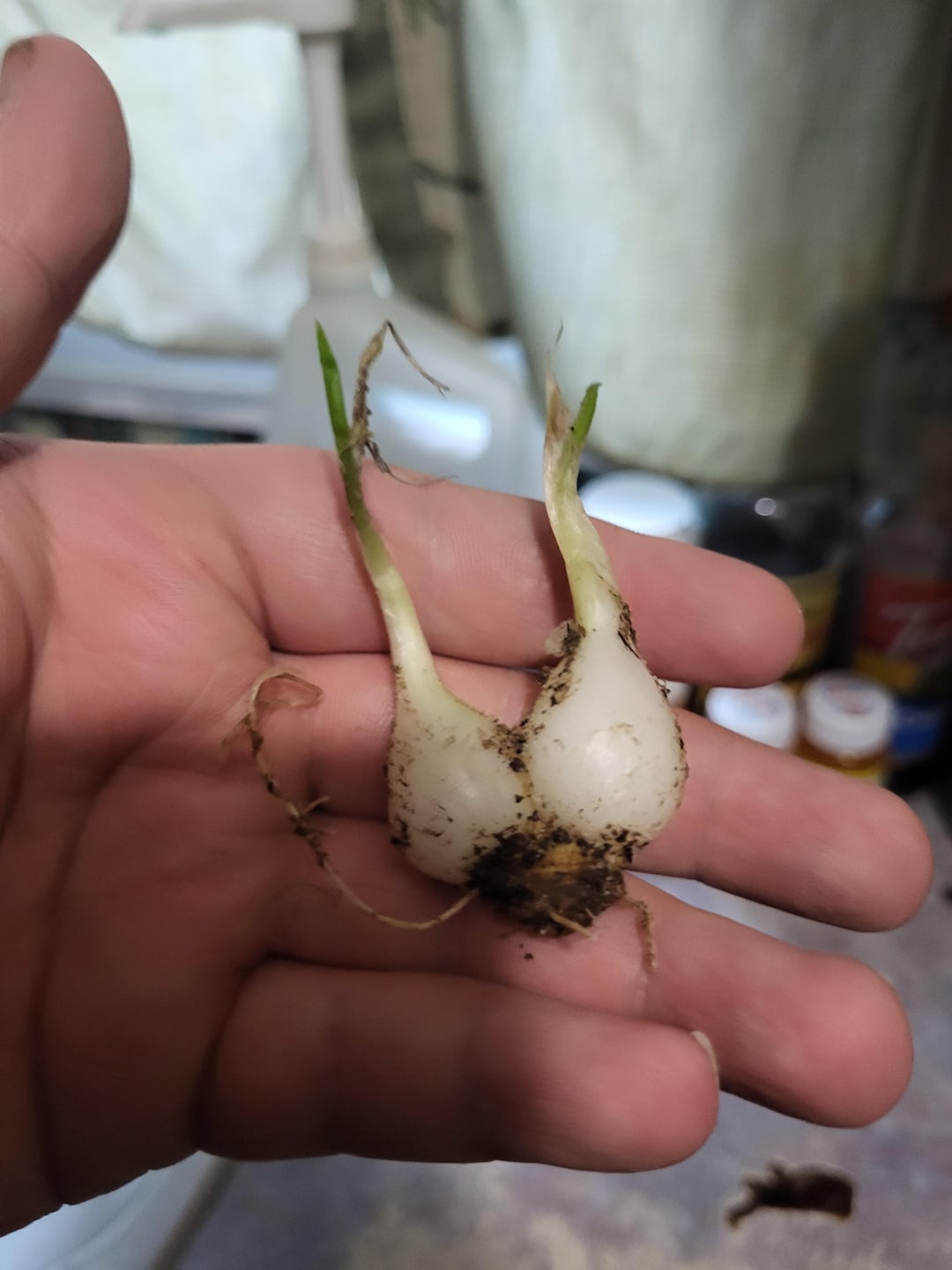 much in the way multiple cloves comprise a garlic bulb, so too is this onion cleaved for planting as two. split them apart and let them grow near—but not too near—one another