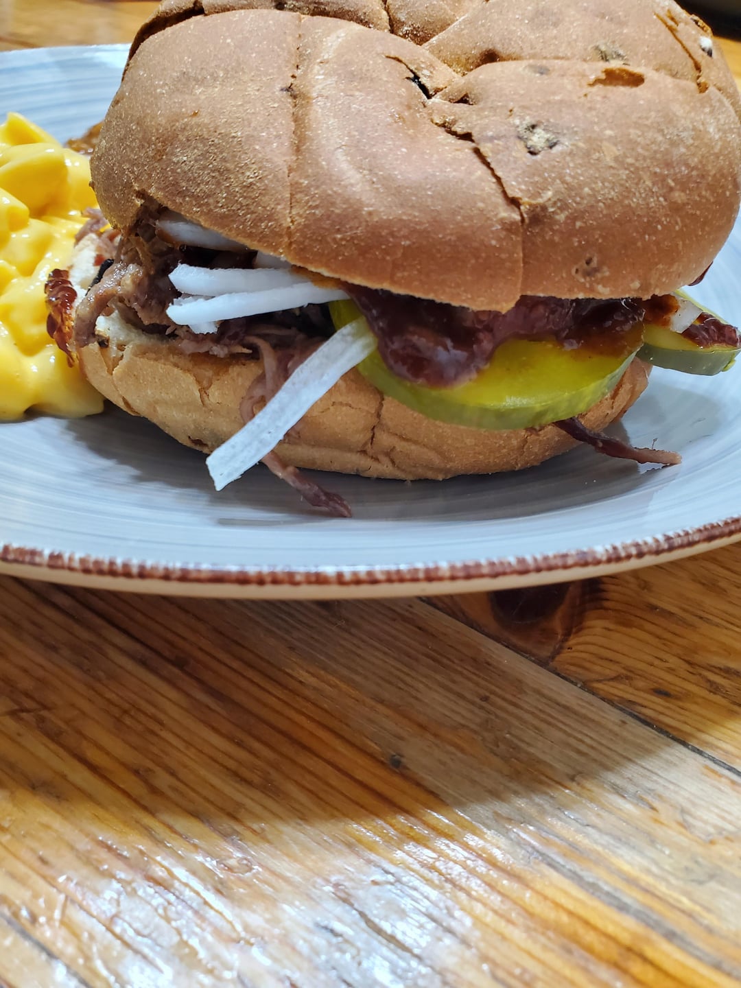 Onion bun with white onion pickles and a raspberry Chipotle sauce