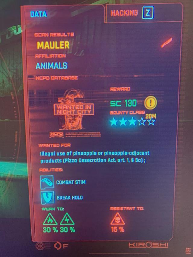 In Night City, it’s considered a felony to put pineapple or pineapple-adjacent products on a pizza according to the Pizza Desecration Act, art 1. § 5a.
