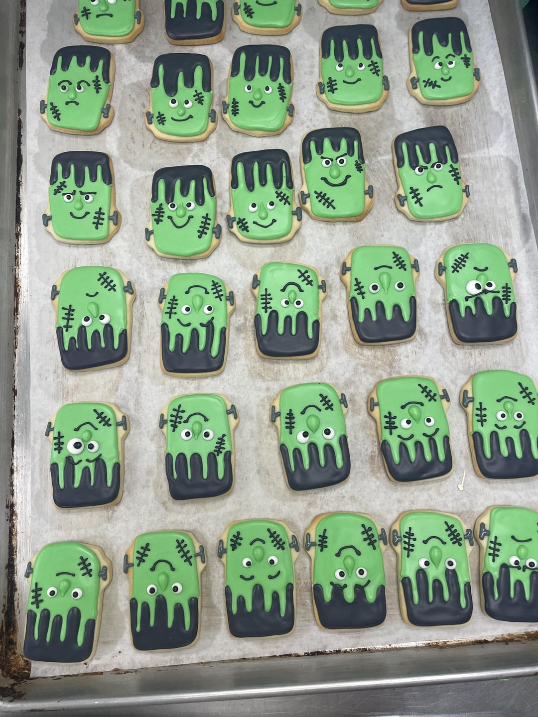 Well done. Love the crazy eyes on all of them. Spiders legs are nice and thin. How’d you do this without lines touching. Funny in cauldron there’s one eye and a bone. Different. Love how Frankenstein look fun upside down.