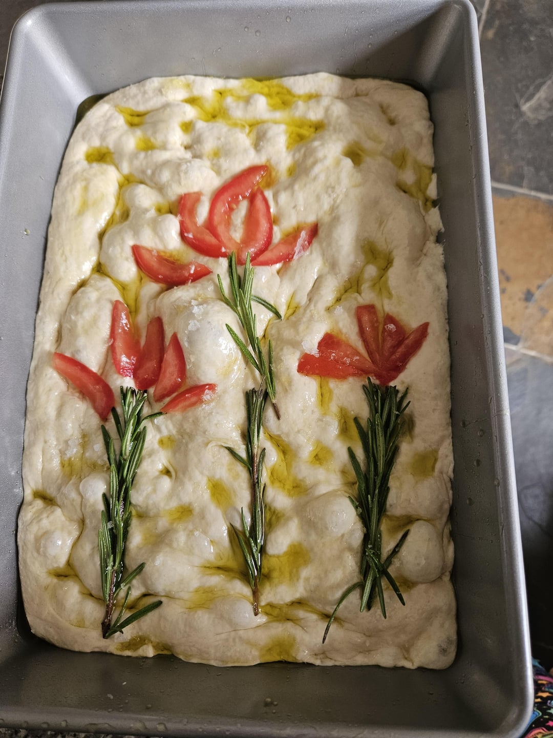 Focaccia looks great. No tomatoes on my piece please and thank you 🙂 🍽️