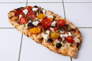 Half pizza dough topped with grana cream, mozza, sausage meat, cherry tomatoes, roasted mushrooms, ricotta salata and chives.