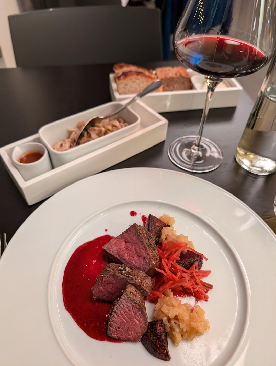 The lasagna was not the prettiest thing I ever ate, but damn was it tasty. If someone told you they were making cabbage lasagna you would probably think them had fallen on hard times. But it was just so good. The venison was equally good, but been there done that. And I loved the dessert, but already sort of forgotten the flavors.