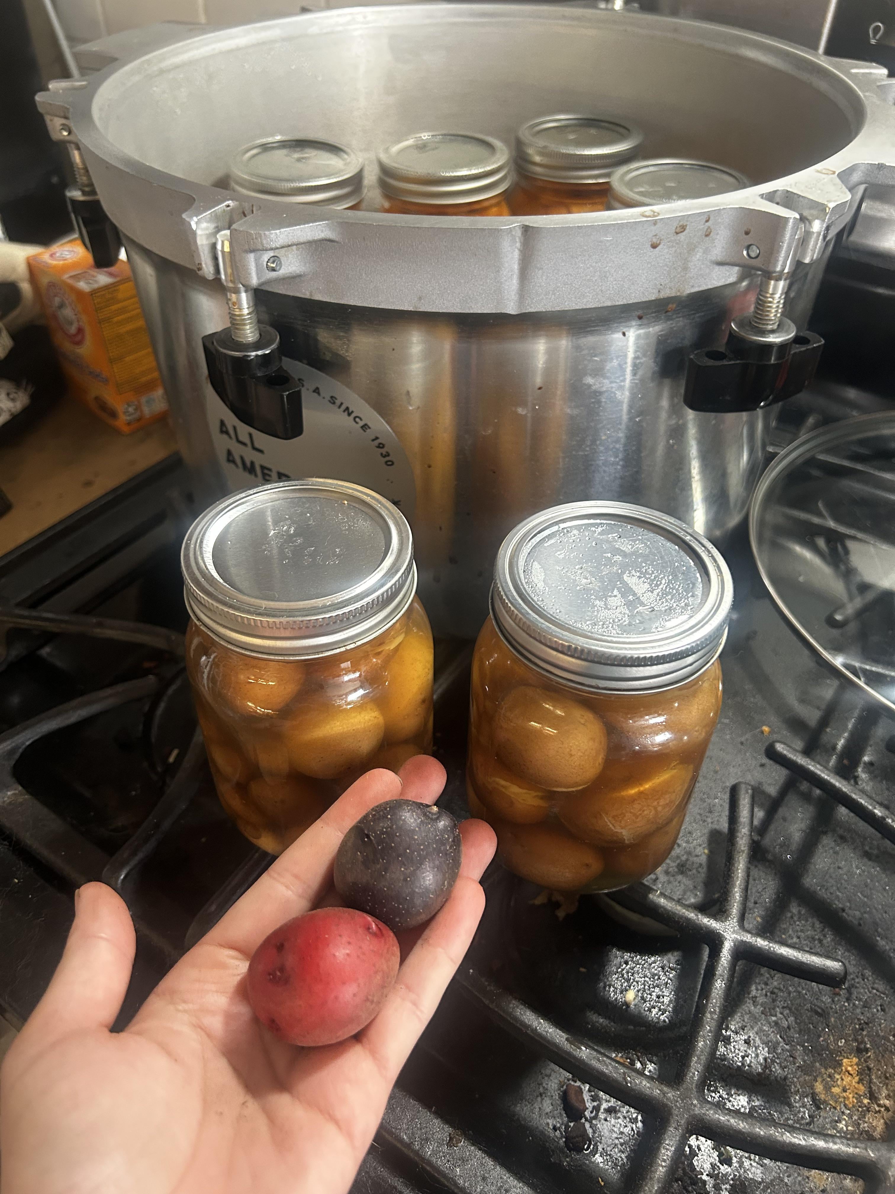 I pressure canned these little potatoes i grew myself. They are all red and purple, i have cooked these in the past and they didn’t lose their color but first time pressure canning them and they turned brown/yellow