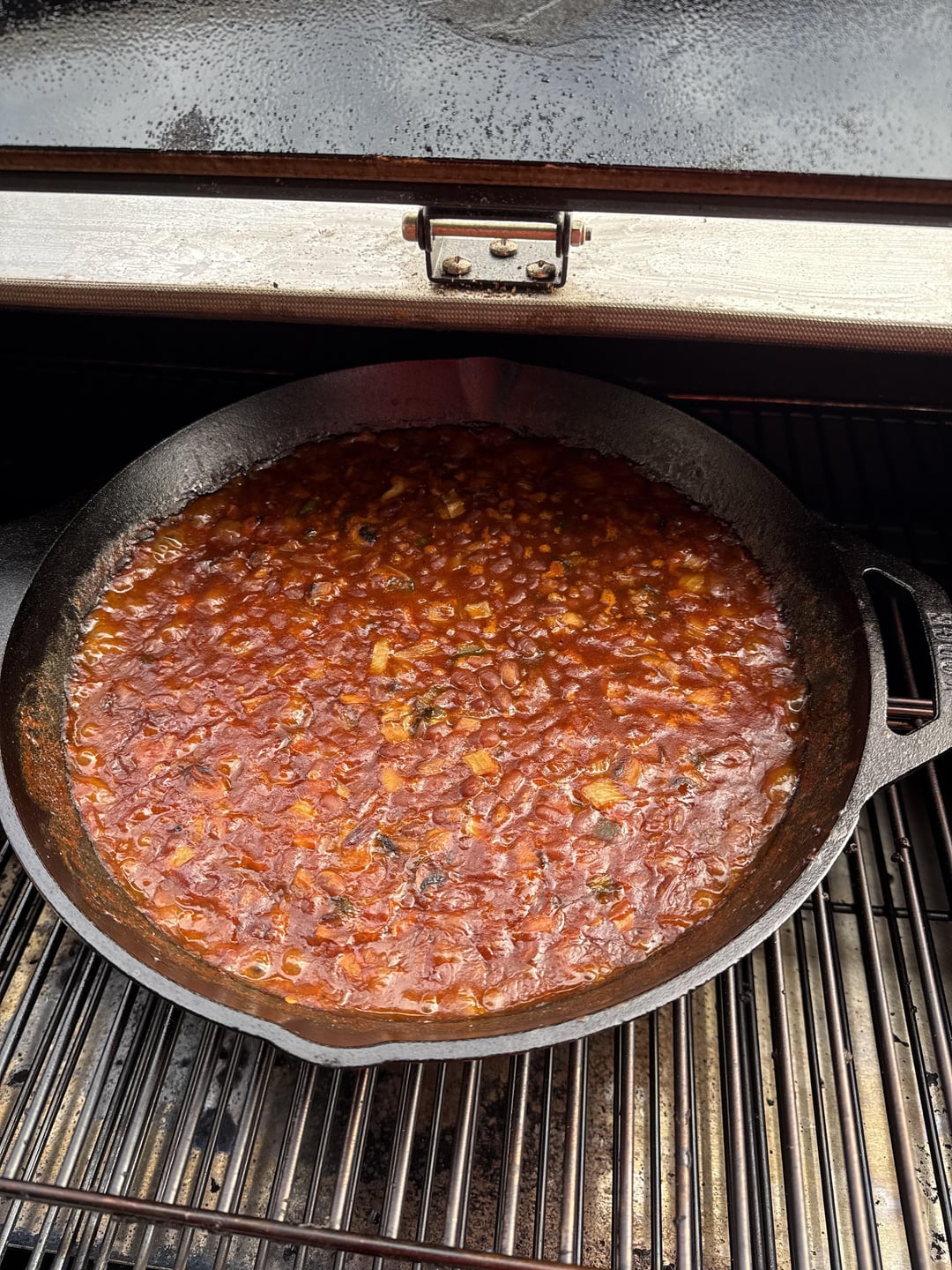 I sautéed some onions, mushrooms and Jalapeños. I used spicy bbq sauce and Sweet Bee Honey from Alabama. A few more ingredients were added and I smoked around 290 for just over 2 hours adding some apple wood to the mixture. Damn good beans. Wished I could share with everyone. I’m cooking some beans with thick cut bacon next for the rest of us in the family who love meat! This one is for my Daughter.