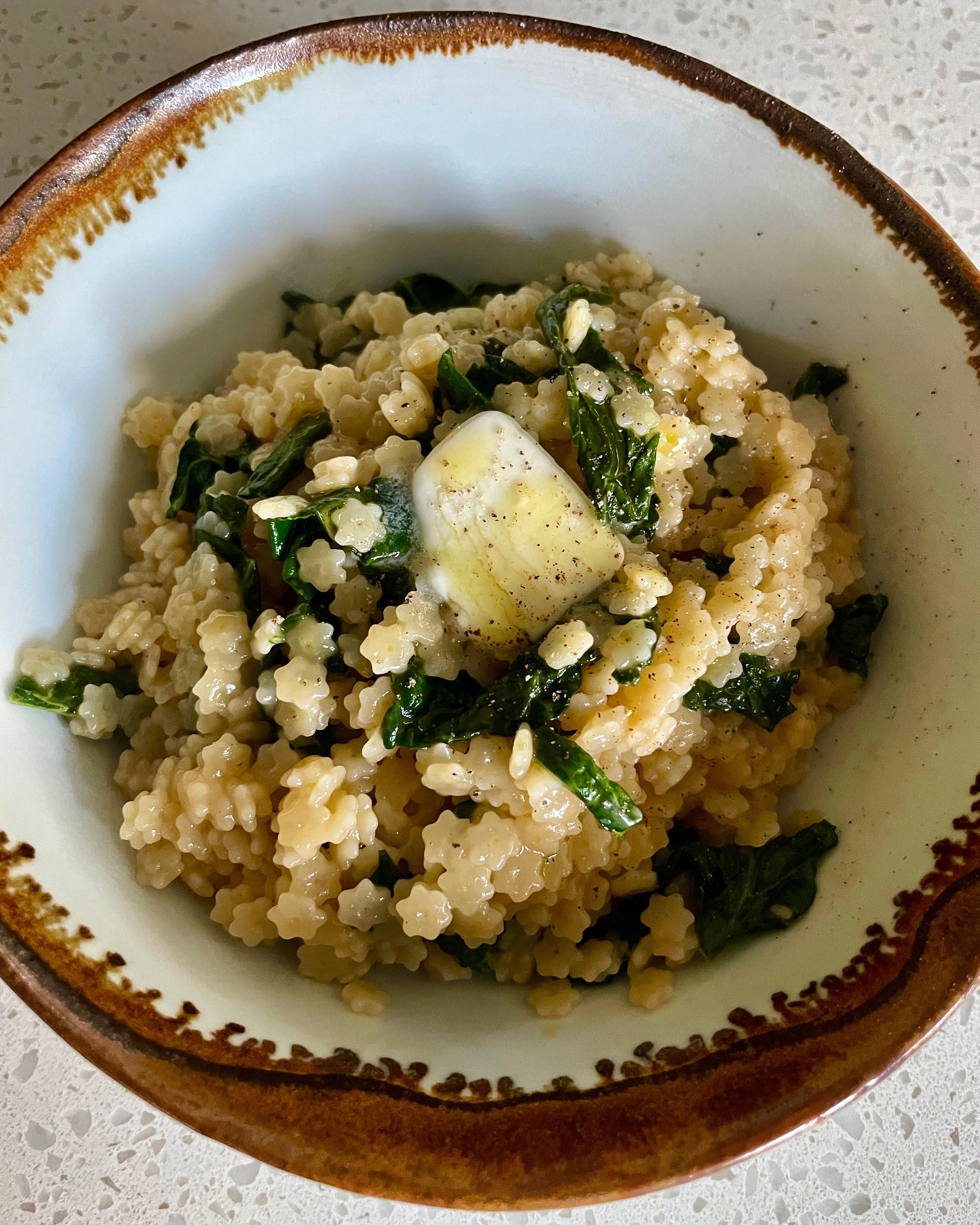 Sauté two bunches of kale in oil with garlic. Put aside. Cook a pound of pastina in 16oz of broth until it’s done. Add kale mixture, butter, olive oil, pecorino, msg, salt, pepper. Enjoy.