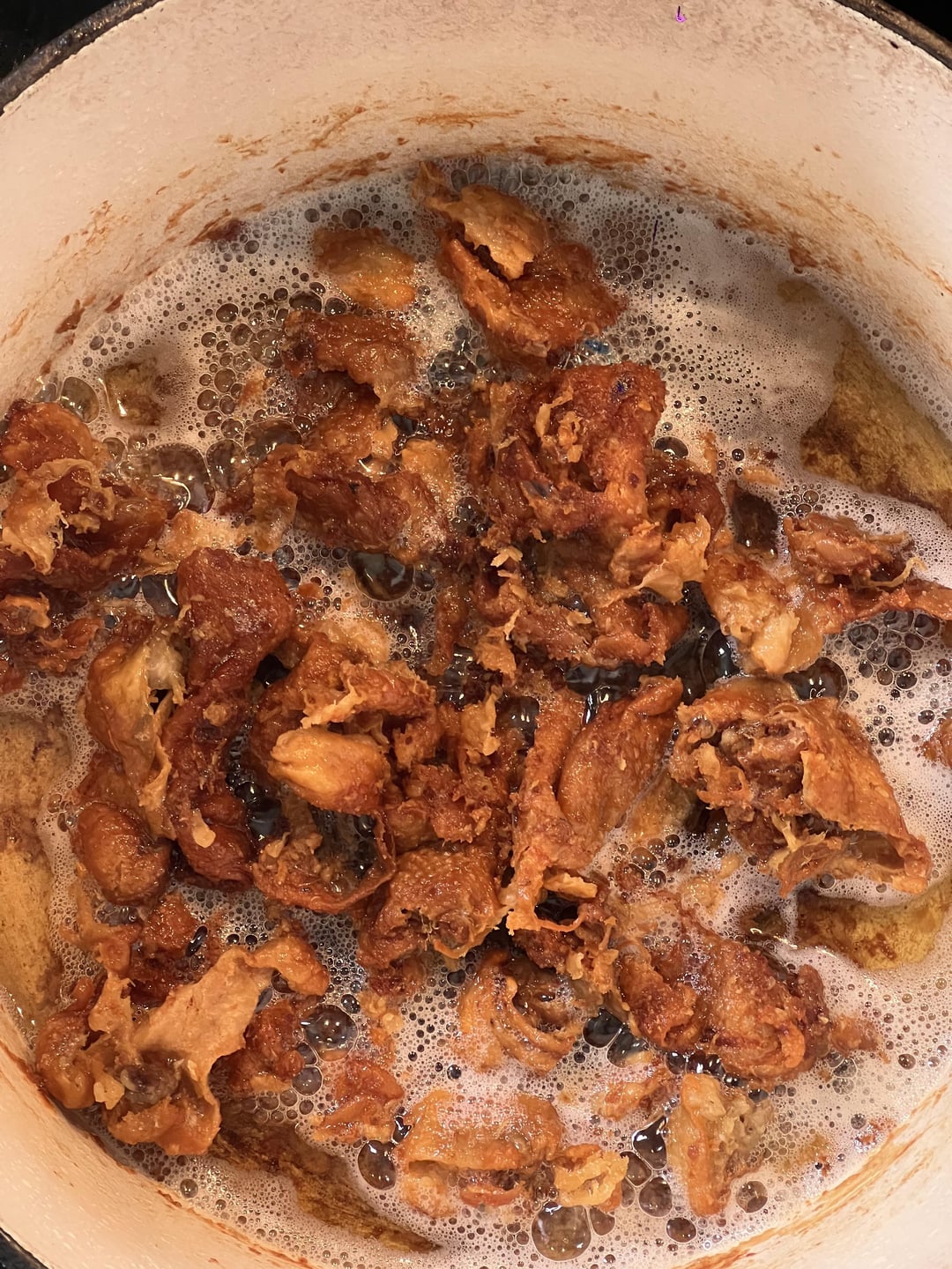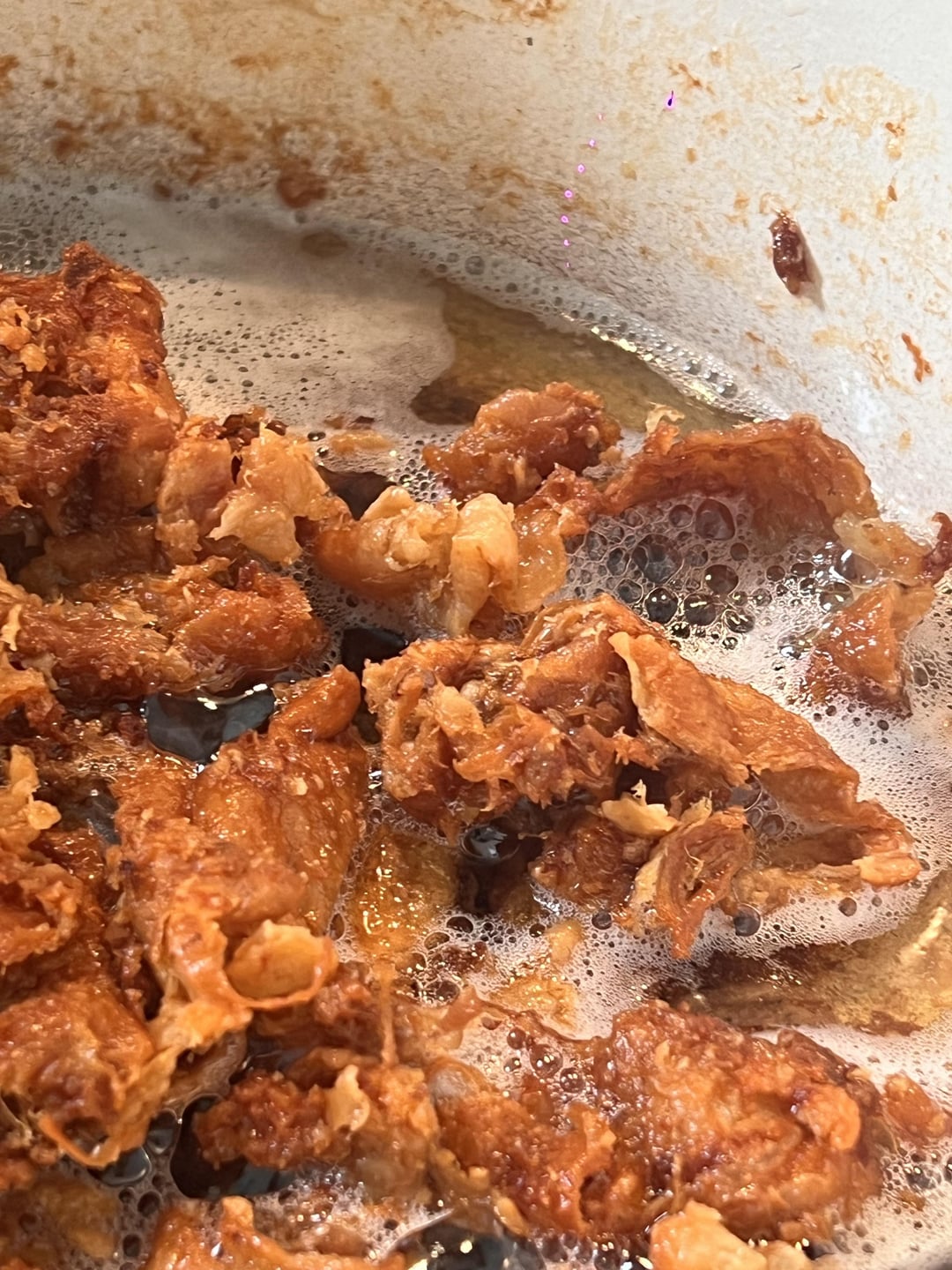 Rendered these skins (covered just in water) for about 4hours at a low-med heat and when the water evaporates they end up frying in the fat (shmaltz). The plan was to make a sugar free bacon jam (or sauce if it doesn’t reduce properly) w the skin chopped up in it