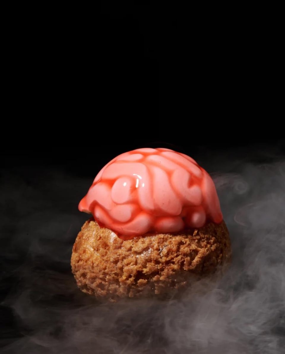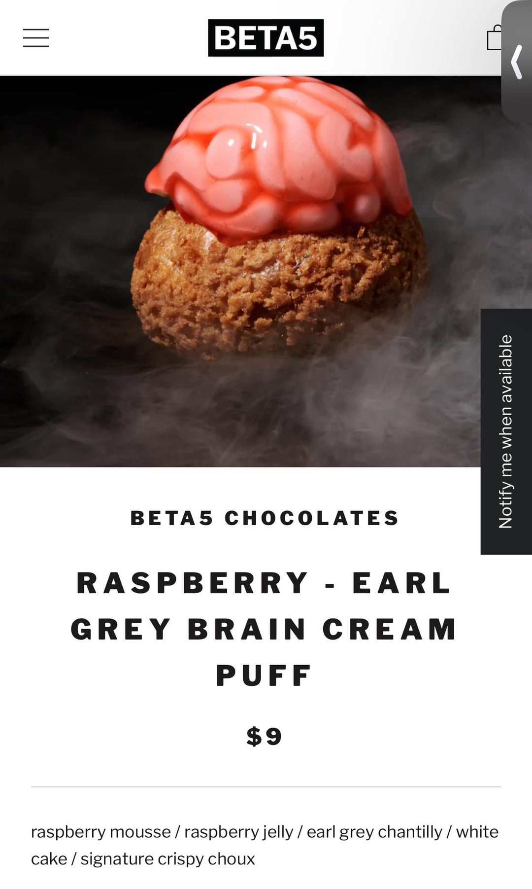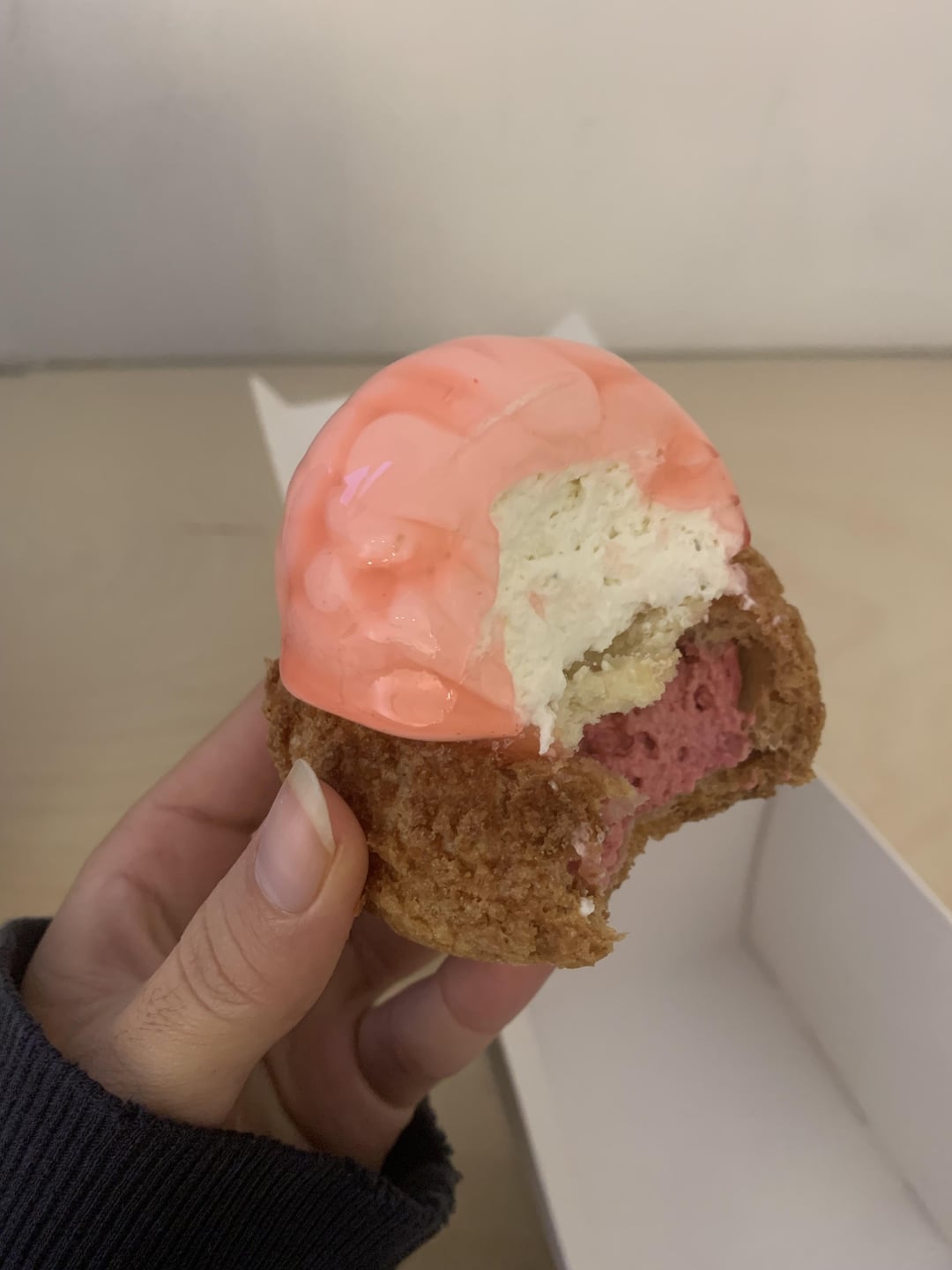 From the website it said it's made of raspberry mousse / raspberry jelly / earl grey chantilly / white cake / signature crispy choux.