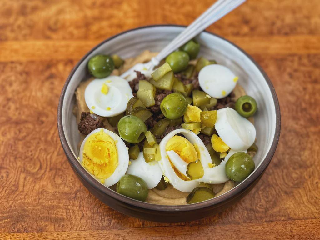 [Israeli Style Extra Smooth Hummus](https://www.seriouseats.com/israeli-style-extra-smooth-hummus-recipe) topped with baharat spice ground beef, Israeli pickles, egg, and Castelvetrano olives. Was supposed to have pita, but, unfortunately, it was no good.