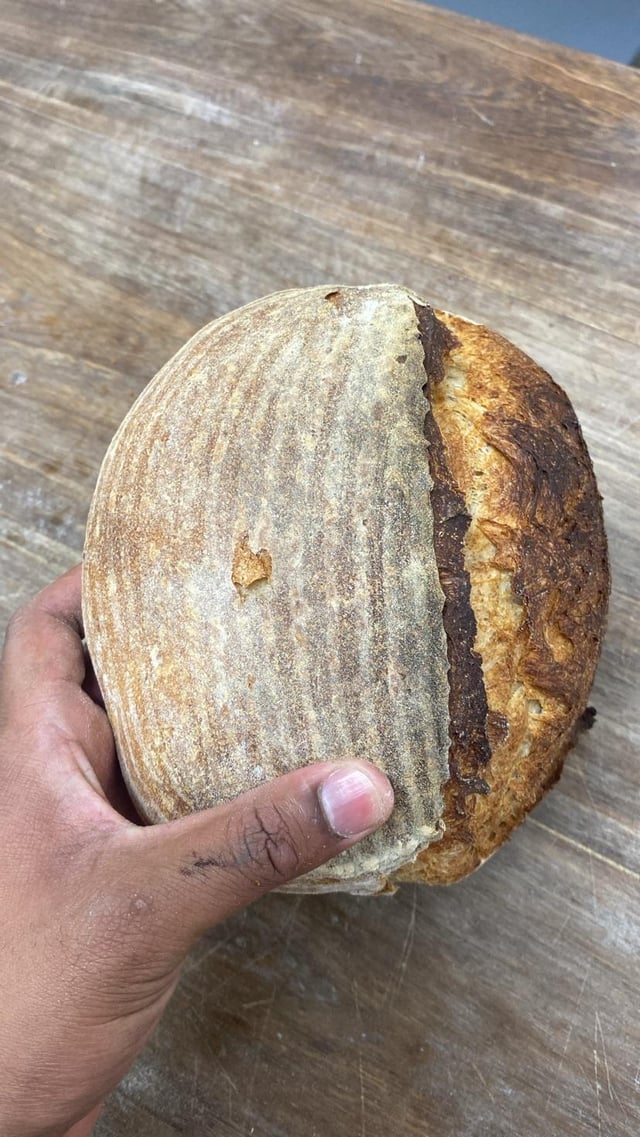 This bread took me like 5 hours to make, from the moment I started mixing the dough to the end of baked. 100% sourdough. My recipe is 75% bread flour, 15% whole wheat flour, 10% rye, 65% water, 2.5% salt and 50% sourdough starter (60%fermented flour)