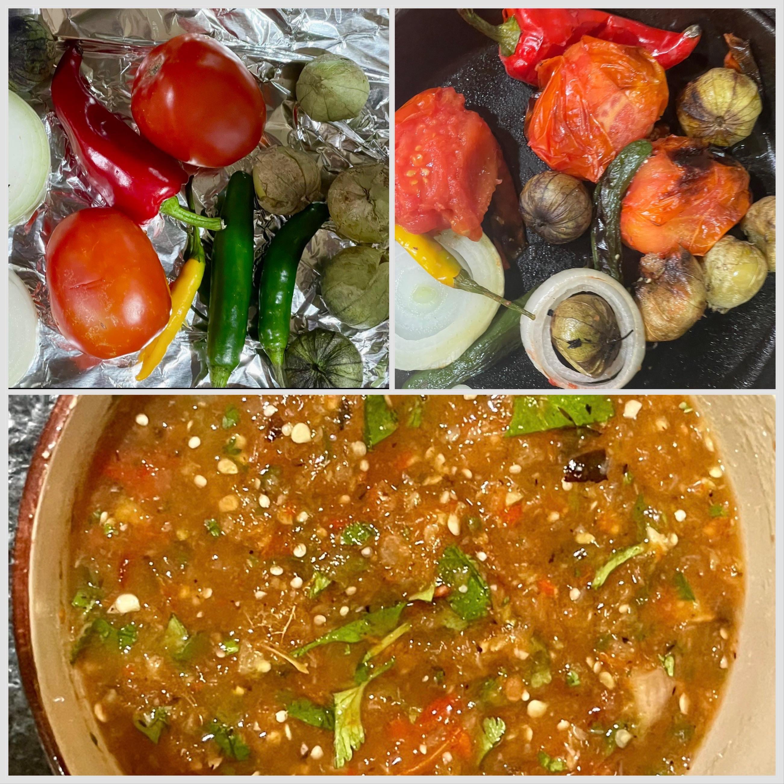 4 Roma tomato 5 tomatillos 1/3 white onion 2 clove garlic 2 Serrano pepper 1 Fresno 1 buena Mulata pepper Salt and pepper 1/2 lime