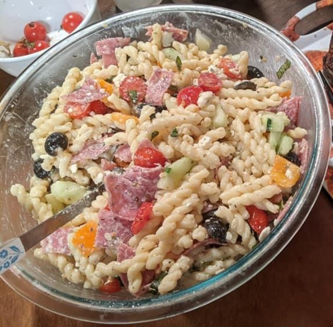• Cut up the remaining ingredients and transfer to a large bowl. Whisk together the dressing. To serve, combine the strained and cooled pasta with the ingredients in the bowl. Toss with the dressing.