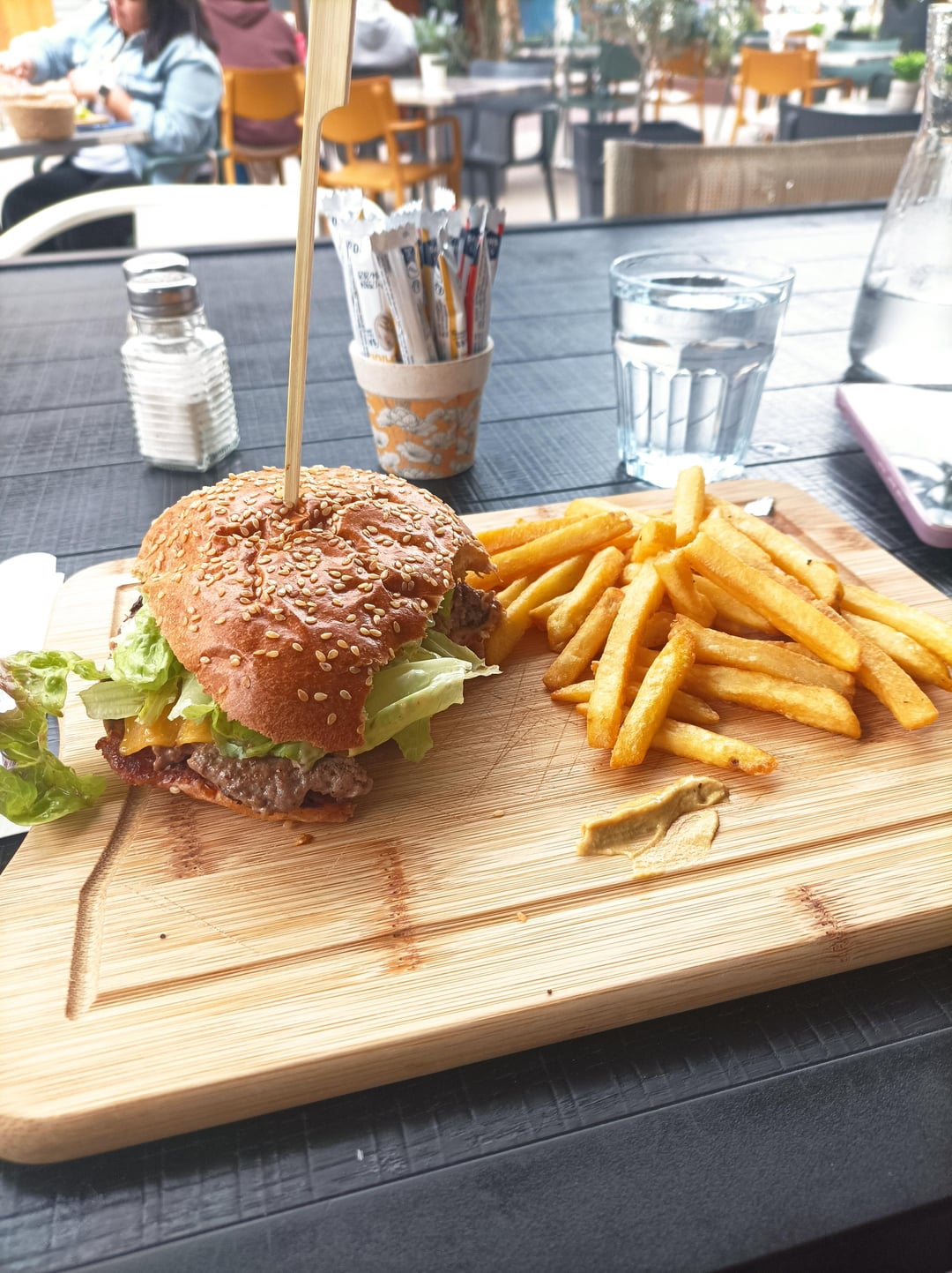 Cheeseburger with 150g of meat (they put the weight on the menu) no burger sauce, plastic cheddar (it's 50 cals normally in my stores)