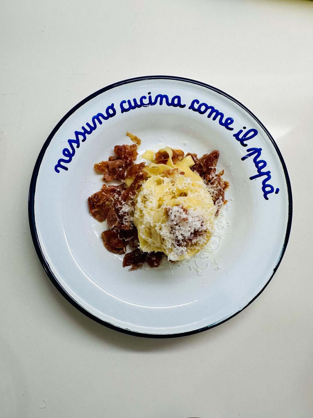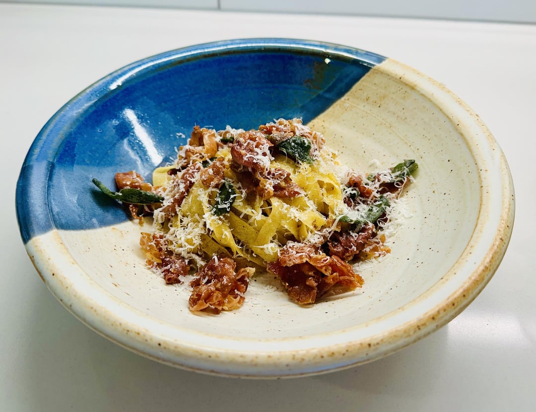 Toddlers first ever hand rolled (with Mattarello) Tagliatelle In Bianco Con Prosciutto Crudo E Burro + a portion for mom with sage. They both killed it.