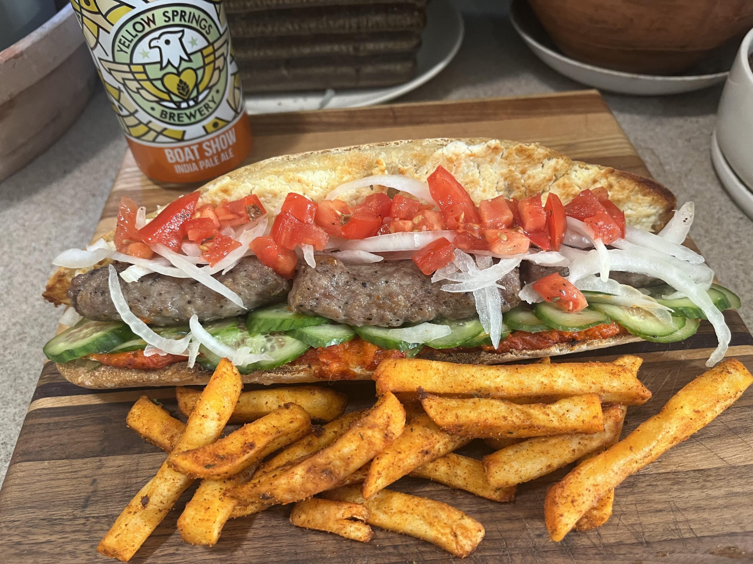 Grilled ćevapčići (Balkan pork, beef, lamb, sausage) with sliced onion, cucumber, and diced tomatoes on a broiled hot ajvar and sheep’s milk cream cheese baguette.