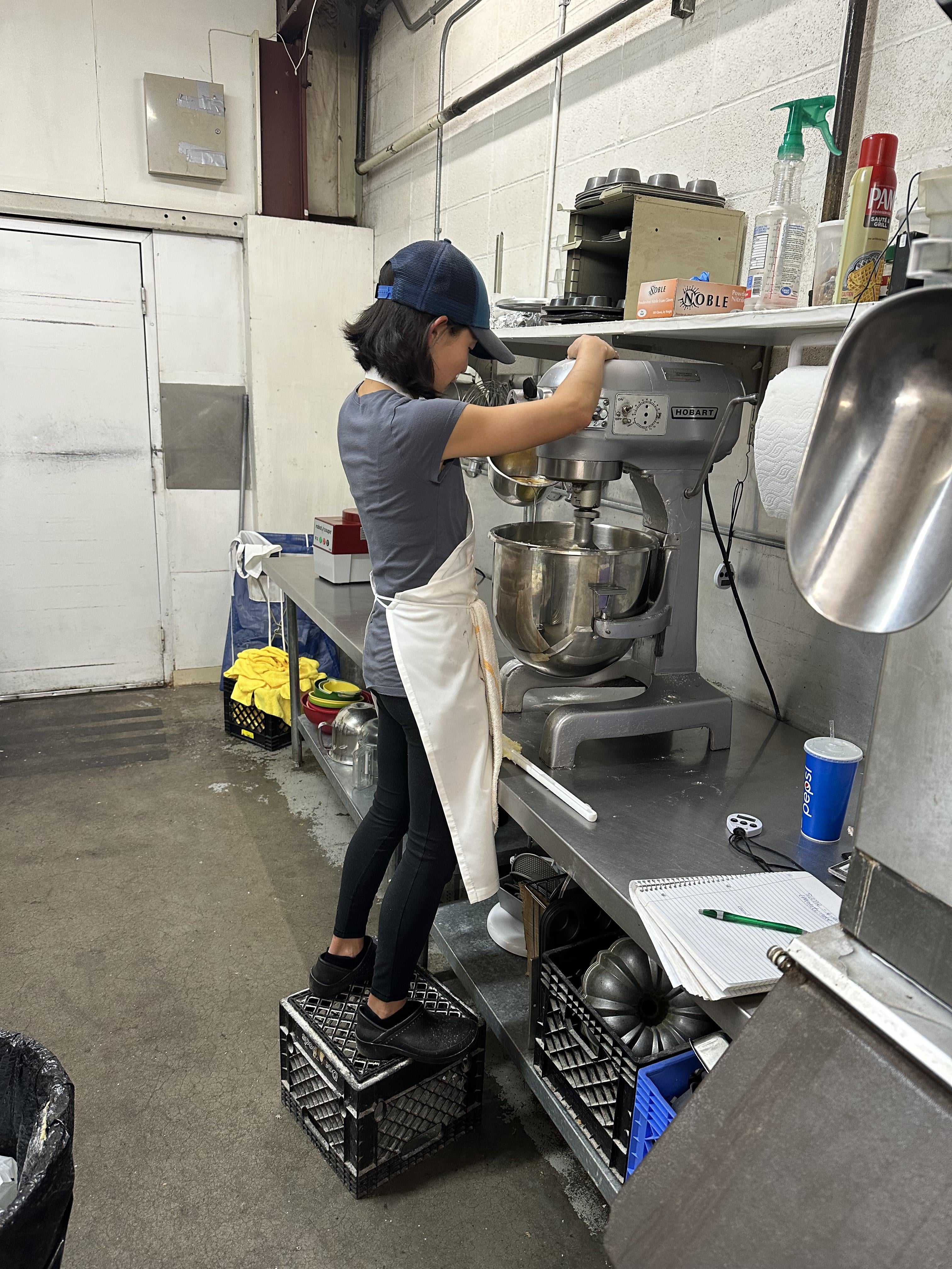Hey, your employer should make accommodations for having a short baker. They’ve taken on someone who’s too short for the setup and can’t exactly get rid of her (both legally and also that would be a dick move to say the least). For safety compliance reasons, you guys definitely need to get that stand mixer lowered for her