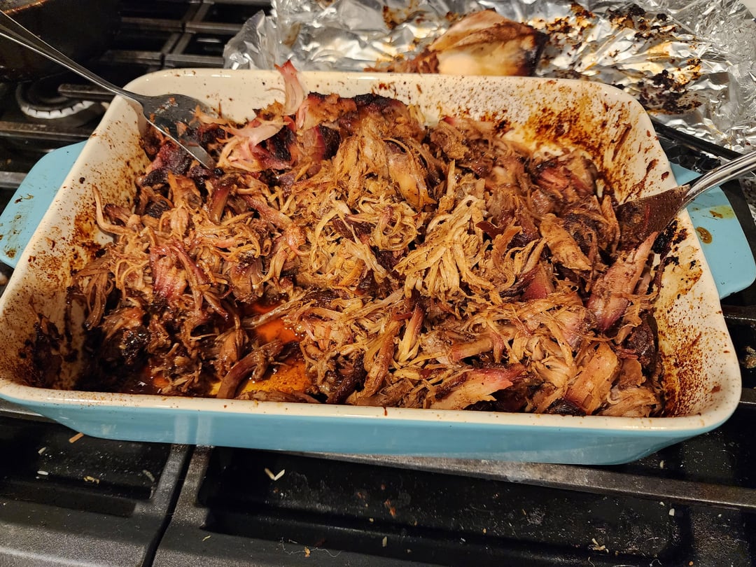 Grabbed a 6# butt and covered it overnight with spices and a sour cherry spread, injected some for good measure. Super smoke at 225 for 6 hours, sprayed with cherry Dr pepper after 3 hours and again every hour later, then made a glaze with remainder of cherry spread and dr pepper and covered it with foil, then into the oven at 350 to reach temp and rest for an hour.