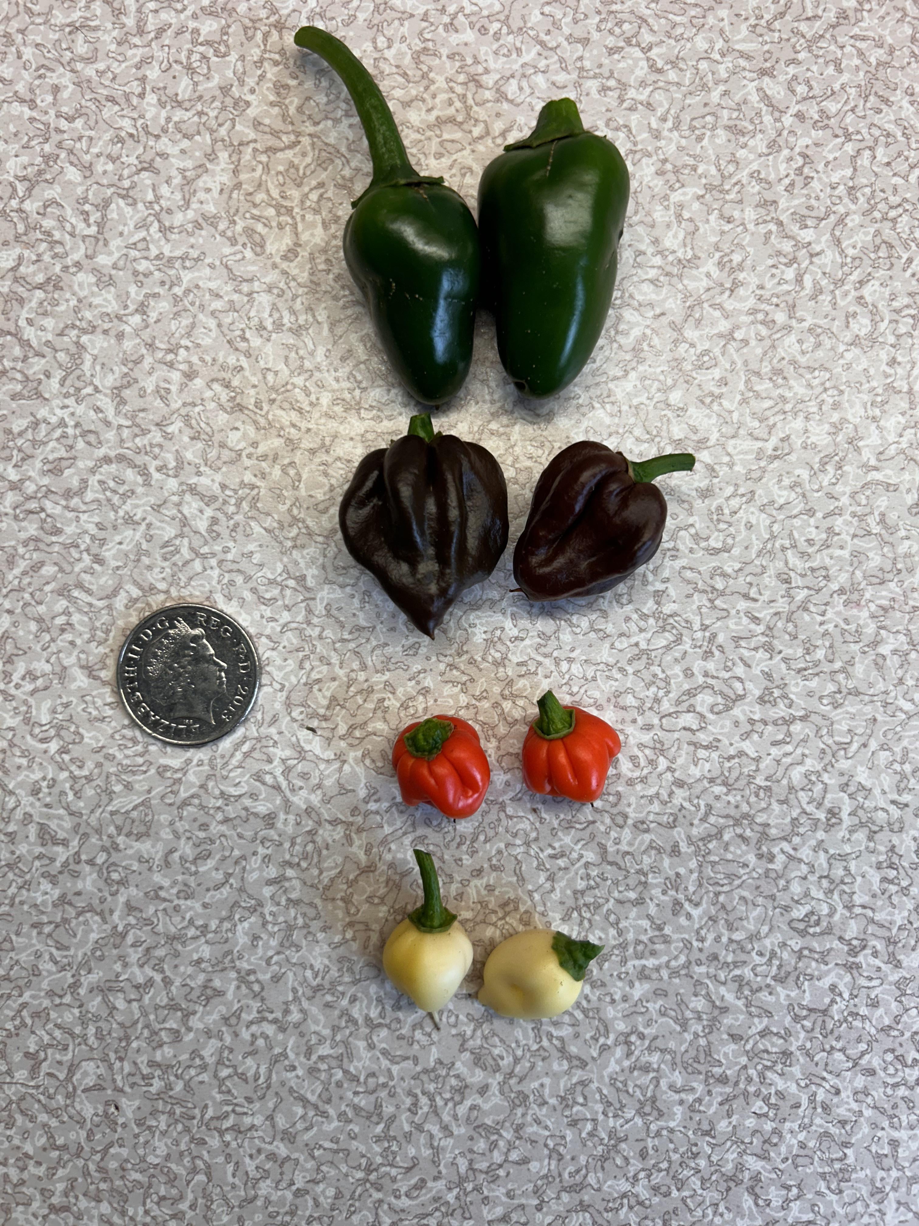 In the photo are examples of my jalapeño early, chocolate habanero, Armageddon & wraith chillis. 10 pence piece for scale!
