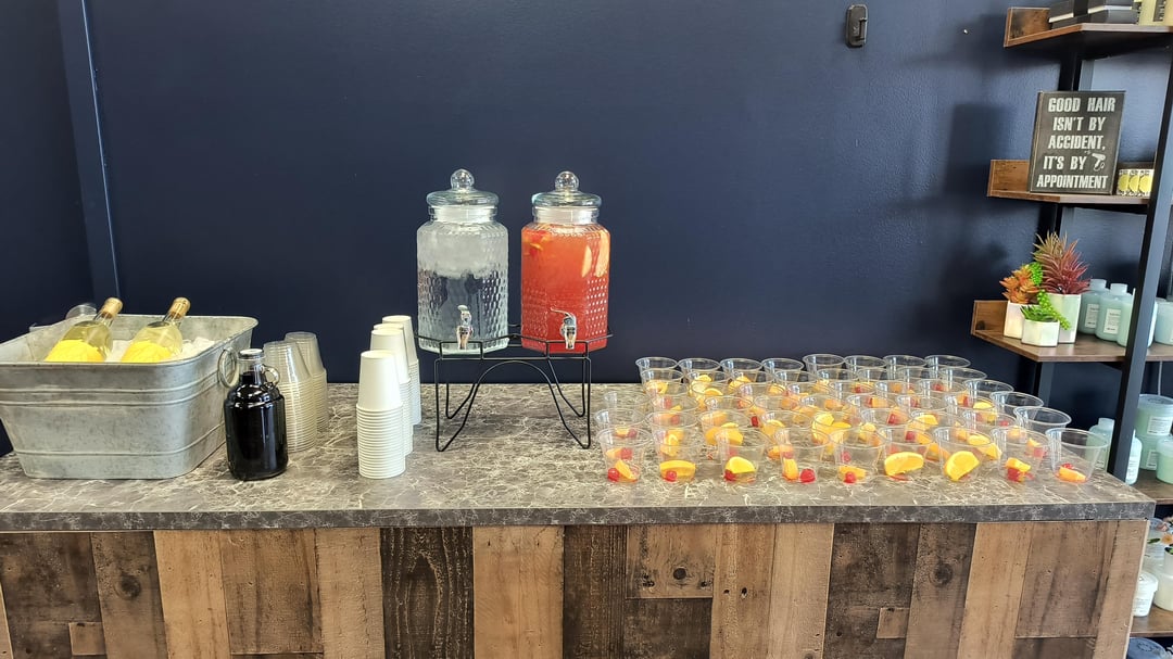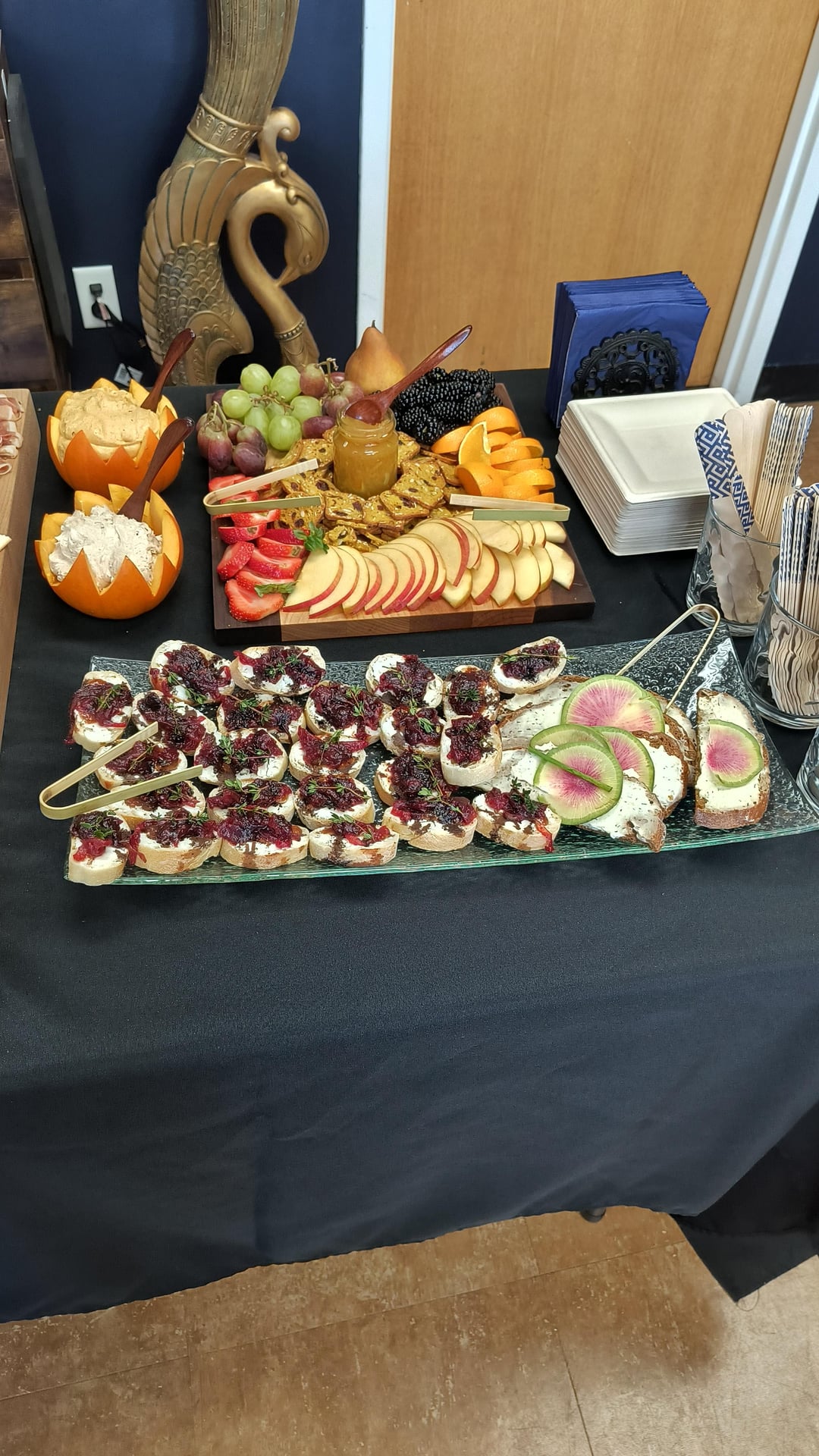 The beverage station I quickly set up as well and provided my host with complementry water and ice (for his wine he brought) and I also made a delicious fall themed punch with apple cider, cranberry juice, orange seltzer, ginger ale, marichino cherries, apples and oranges.