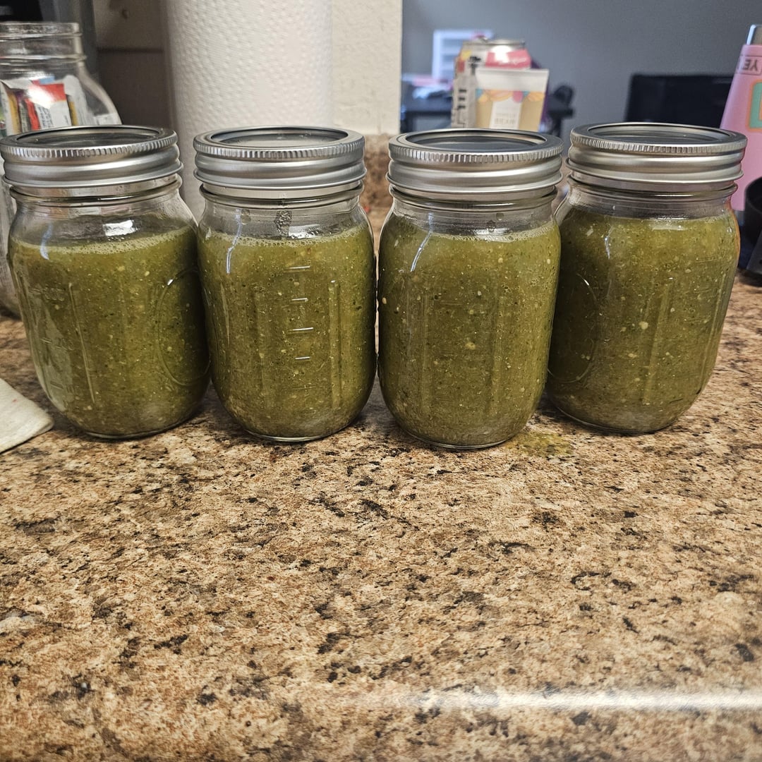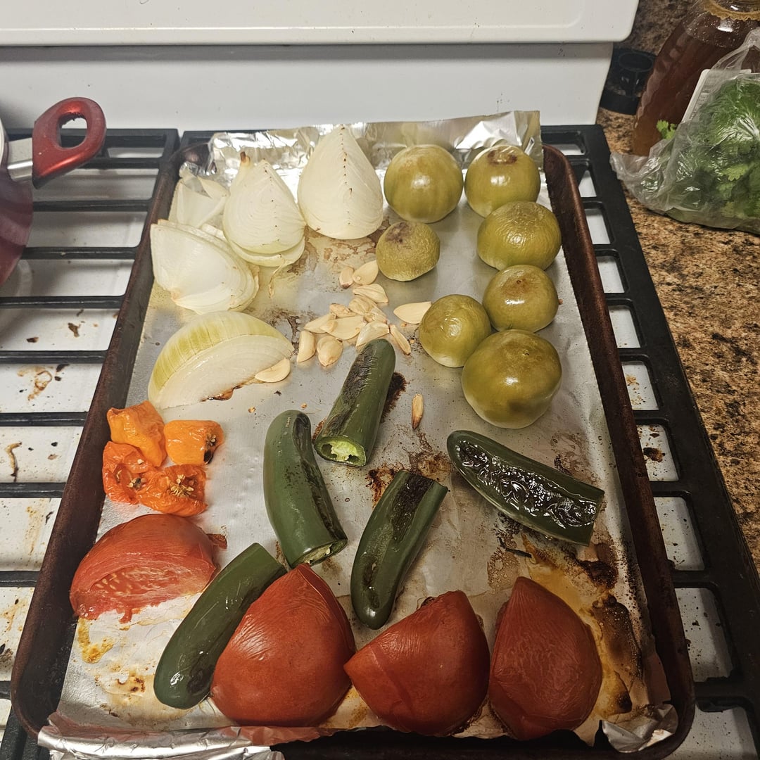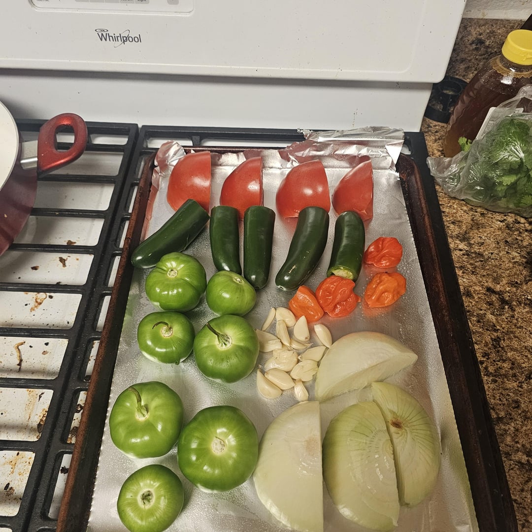 5 jalapeños, 6 or so tomatilos, 4 habaneros, 1 tomato, 1 big ass onion, 1 bunch of cilantro. Roast at about 425 degrees 10 minutes each side. Throw in salt and lime juice after 1st blend.